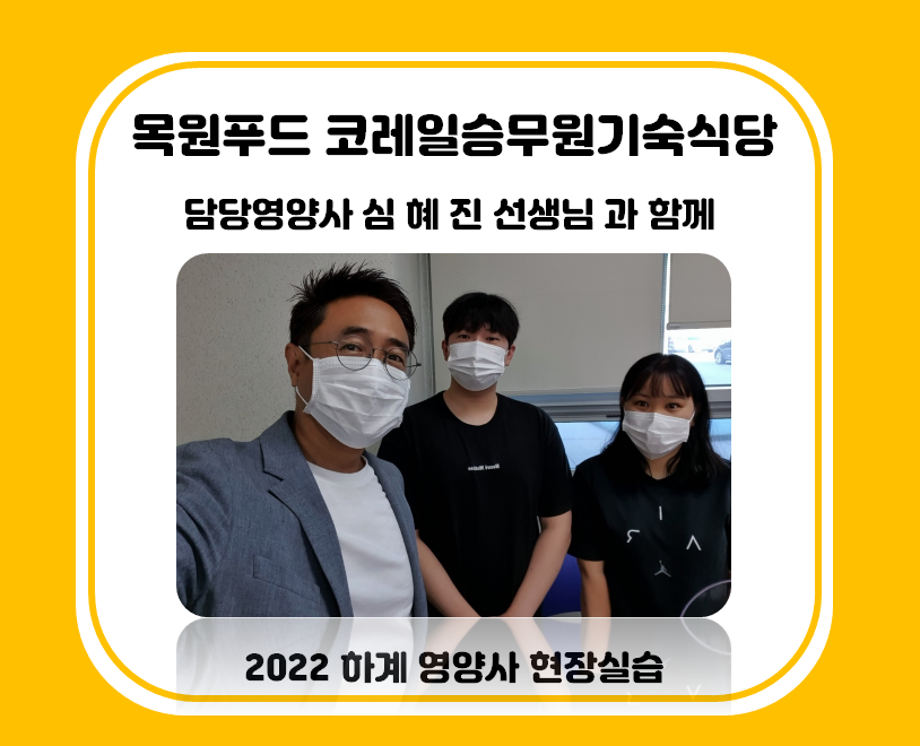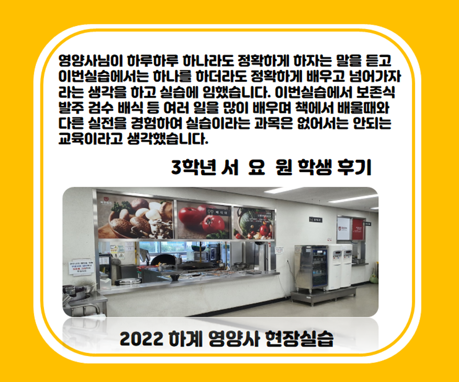 본문 시작 홈으로 커뮤니티 학부소개 진로·취업 교육과정 커뮤니티 대학원 입학상담 홈페이지가이드 갤러리 공지사항 갤러리 학생회 동문회 전공자료실 전공동아리 Youtube Instagram 갤러리 페이스북 트위터 프린트 2022 하계영양사 현장실습(목원푸드 코레일 승무원기숙식당) 바이오식품영양학부 2066 2022-07-18 목록 이전2022 하계영양사 현장실습(동일여자고등학교) 다음 2022 하계영양사 현장실습(제천어린이급식지원센터) 담당부서 : 바이오식품영양학부 담당자 : - 연락처 : 043-649-1430 최종수정일 : 2024-10-26 만족도조사 만족도 조사 이 페이지에서 제공하는 정보에 대하여 만족하시나요? 매우만족 만족 보통 불만족 매우불만족
