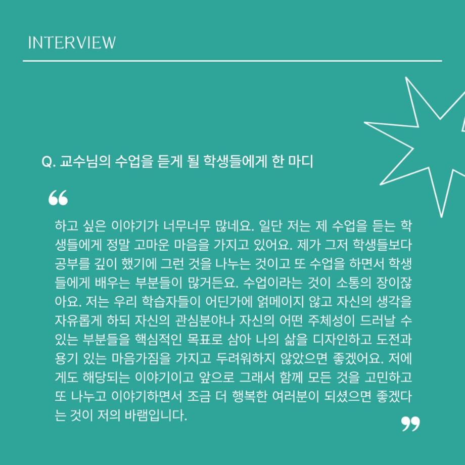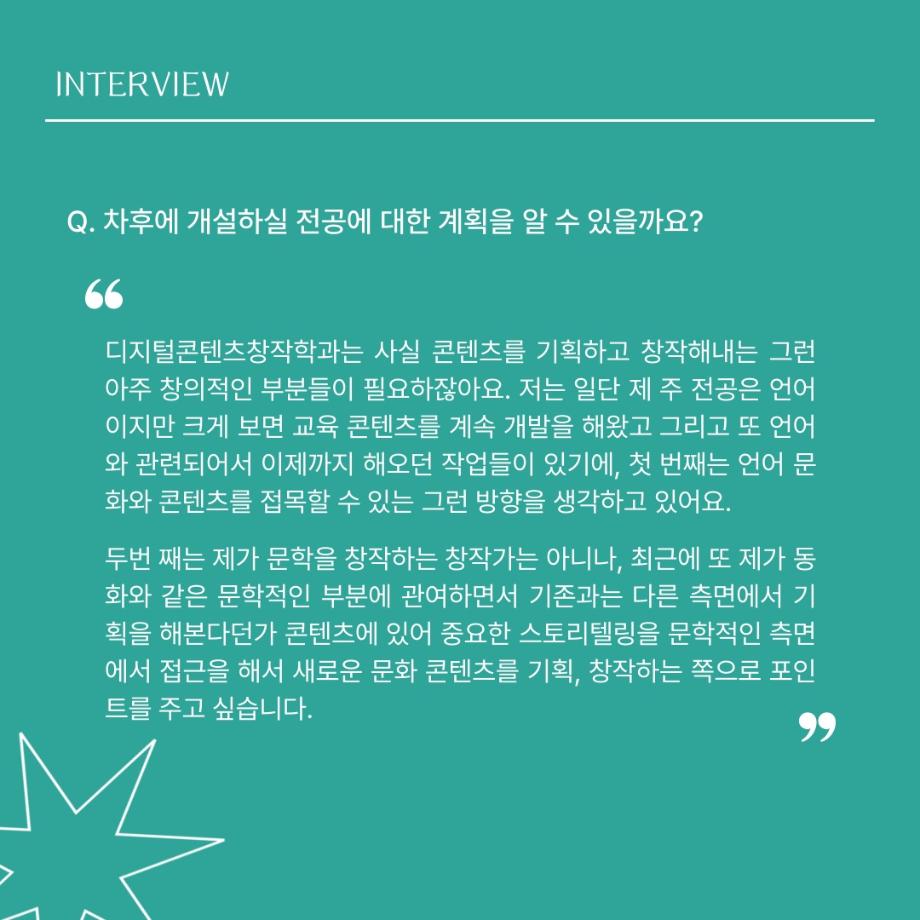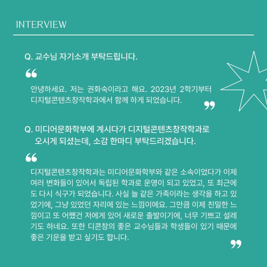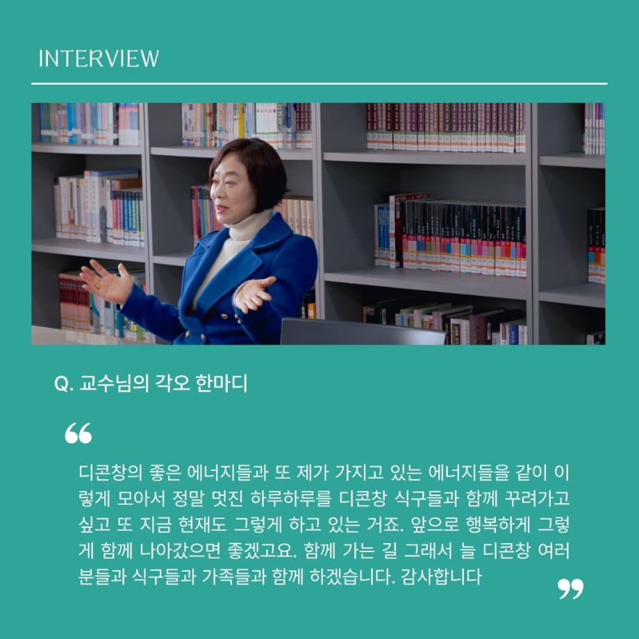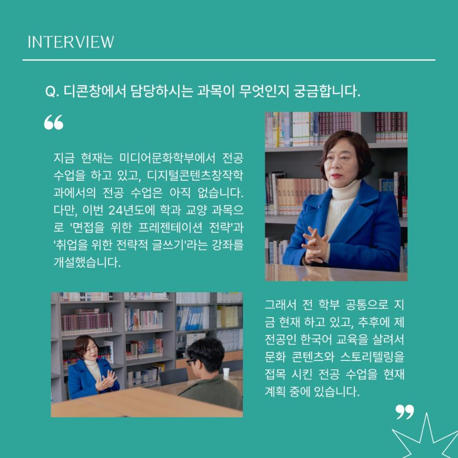 본문 시작 홈으로 MCC News 학과소개 교수소개 학과과정 MCC News MCC SNS 홈페이지가이드 교수 및 졸업생 학과 및 재학생 교수 및 졸업생 미디어 정보통 교수 및 졸업생 페이스북 트위터 프린트 디지털콘텐츠창작학과 권화숙 교수님 인터뷰 📸 디지털콘텐츠창작학과 2605 2024-04-17 작년 2023년 2학기부터 디지털콘텐츠창작학과로 오시게 된 권화숙 교수님을 모시고 인터뷰를 진행하였습니다! 권교수님의 각오와 향후 계획에 대한 이야기를 함께 들어봐요 😚 목록 이전세명대 김기태 교수와 디자인인포 박재원 대표, 9년째 장학금 기탁 다음 디지털콘텐츠창작학과 김기태 교수님 인터뷰 📸 담당부서 : 미디어콘텐츠창작학과 담당자 : - 연락처 : 043-649-1741 최종수정일 : 2024-10-26 만족도조사 만족도 조사 이 페이지에서 제공하는 정보에 대하여 만족하시나요? 매우만족 만족 보통 불만족 매우불만족