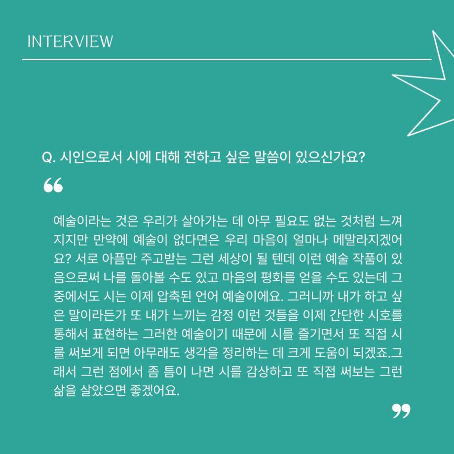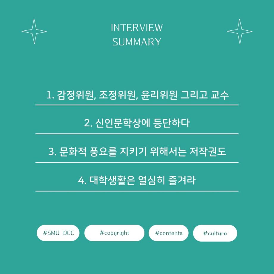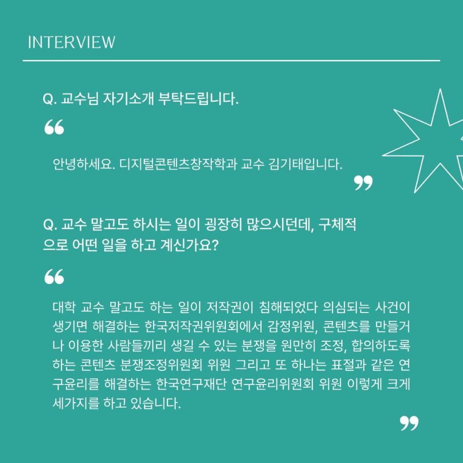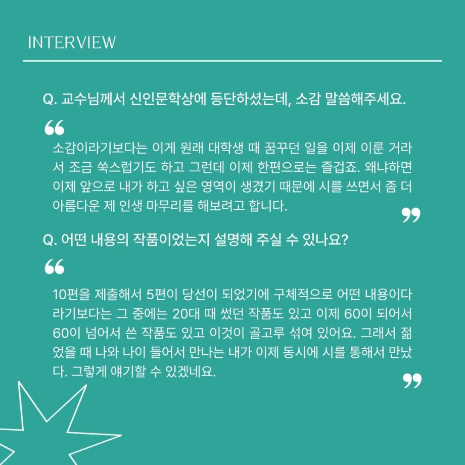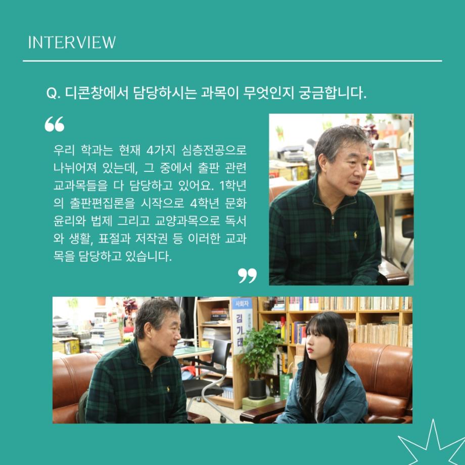 본문 시작 홈으로 MCC News 학과소개 교수소개 학과과정 MCC News MCC SNS 홈페이지가이드 교수 및 졸업생 학과 및 재학생 교수 및 졸업생 미디어 정보통 교수 및 졸업생 페이스북 트위터 프린트 디지털콘텐츠창작학과 김기태 교수님 인터뷰 📸 디지털콘텐츠창작학과 2437 2024-04-24 한국 저작권에서 빼놓을 수 없는 인물이자 중견 문예지 ‘계간 시현실’에 2024 신인문학상에 당선되어 신인 시인이 되신 김기태 교수님을 모시고 인터뷰했습니다. 다양한 활동을 해오신 김기태 교수님의 한 말씀 우리 함께 들어봐요! 목록 이전디지털콘텐츠창작학과 권화숙 교수님 인터뷰 📸 다음 📚디지털콘텐츠창작학과 권화숙 교수님 저자 동화책 소개📚 담당부서 : 미디어콘텐츠창작학과 담당자 : - 연락처 : 043-649-1741 최종수정일 : 2024-10-26 만족도조사 만족도 조사 이 페이지에서 제공하는 정보에 대하여 만족하시나요? 매우만족 만족 보통 불만족 매우불만족