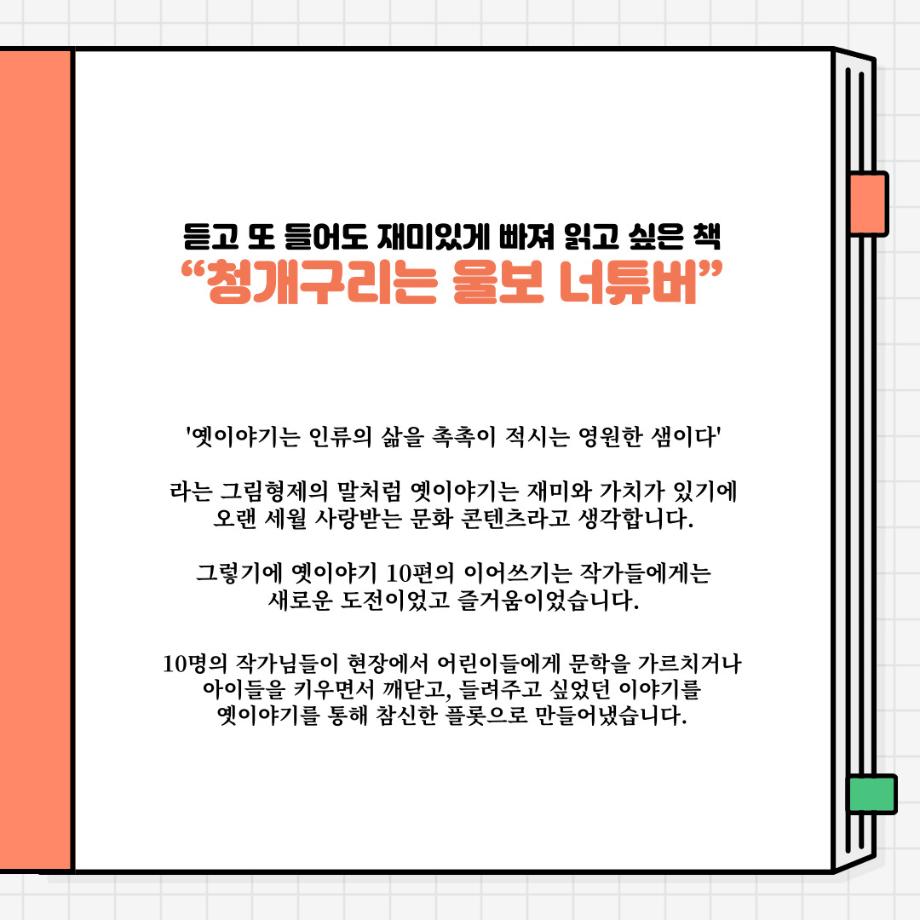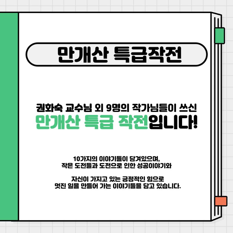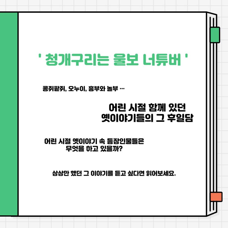 권화숙 교수님 외 9명의 작가님들이 쓰신 청개구리와 울보 너튜버 속 만개산 특급 작전입니다. 10가지의 이야기들이 담겨있으며 작은 도전들과 도전으로 인한 성공이야기, 자신이 가지고 있는 긍정적인 힘으로 멋진 일을 만들어 가는 이야기들을 담고 있습니다.