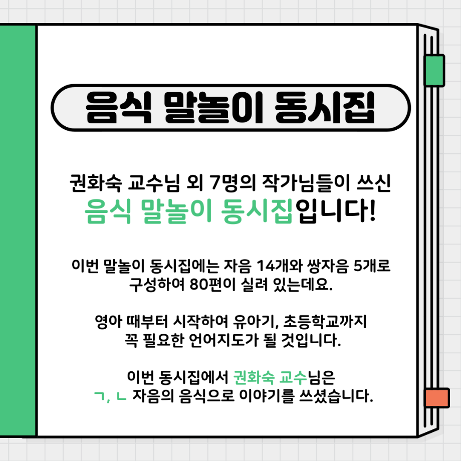 본문 시작 홈으로 MCC News 학과소개 교수소개 학과과정 MCC News MCC SNS 홈페이지가이드 교수 및 졸업생 학과 및 재학생 교수 및 졸업생 미디어 정보통 교수 및 졸업생 페이스북 트위터 프린트 권화숙 교수님의 동시집 '음식 말놀이'를 소개합니다! 디지털콘텐츠창작학과 2631 2024-08-22 이번 동시집은 권화숙 교수님 외 7명의 작가님들이 집필을 하셨습니다. 영아 때부터 시작하여 유아기, 초등학교까지 꼭 필요한 언어지도 책으로서 자음 14개와 쌍자음 5개로 구성하여 80편이 실려 있습니다!이 동시집을 읽다 보면 먹고 싶은 것이 자꾸 생각이 나 점심 메뉴는 어떤 것이 될까 궁금해지네요. 학우 여러분들의 많은 관심과 사랑 부탁드립니다! 목록 이전🎊권화숙 교수님의 제27회 신사임당 이율곡 서예대전 입선🎊 다음 🗣16학번 선배님의 현장 노하우🗣 담당부서 : 미디어콘텐츠창작학과 담당자 : - 연락처 : 043-649-1741 최종수정일 : 2024-10-26 만족도조사 만족도 조사 이 페이지에서 제공하는 정보에 대하여 만족하시나요? 매우만족 만족 보통 불만족 매우불만족