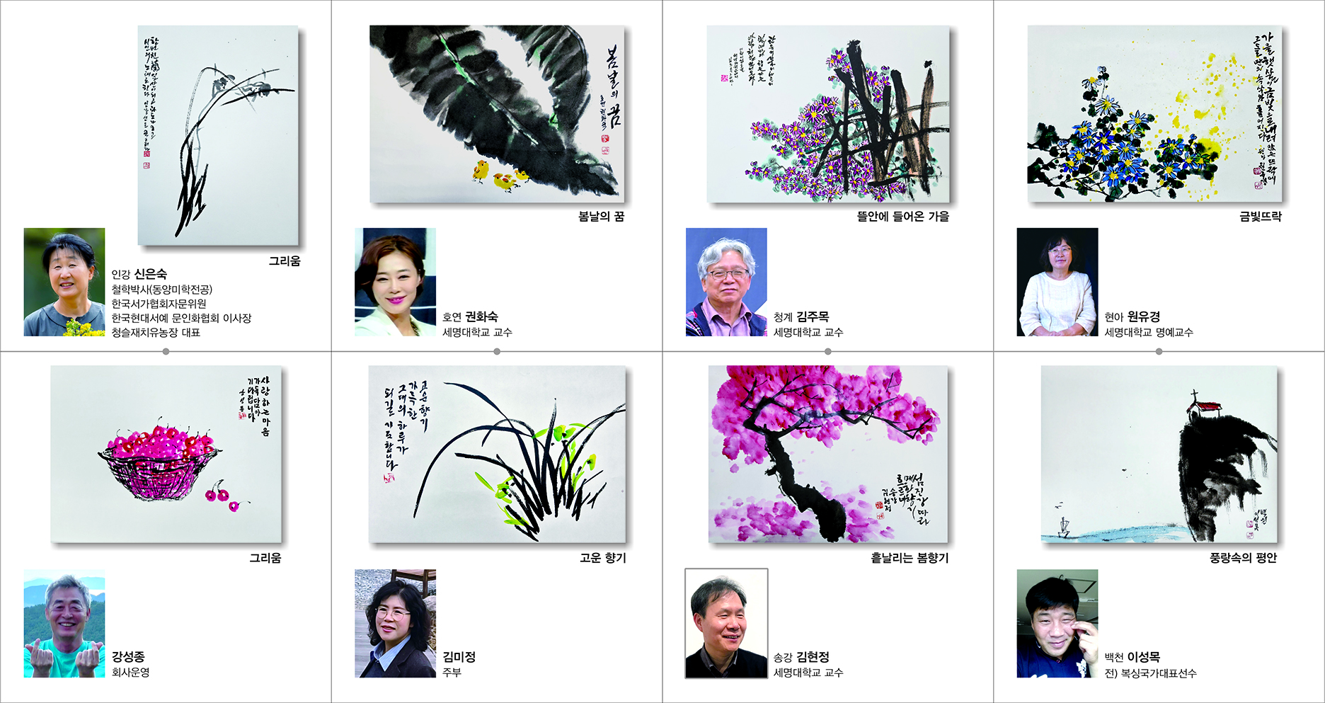 본문 시작 홈으로 MCC News 학과소개 교수소개 학과과정 MCC News MCC SNS 홈페이지가이드 교수 및 졸업생 학과 및 재학생 교수 및 졸업생 미디어 정보통 교수 및 졸업생 페이스북 트위터 프린트 권화숙 교수님 향기로운 삶, 문인화 전시회 안내 미디어콘텐츠창작학과 1123 2025-12-04 향기로운 삶,문인화' 강좌 수강생들의 그동안의 배움과 성과를 공유하는 2025년 제5회 문인화전 – 「여백의 시간을 거닐다 II」 전시회를 개최합니다. 📍 전시 안내 [일시] 개막식: 2025년 12월 4일(목) 16:00 전시기간: 2025년 12월 4일(목) 16:00–18:00 2025년 12월 5일(금)–12월 8일(월) 10:00–17:00 [장소] 제천시민회관 2층 전시실(충북 제천시 의림대로 125) 목록 이전권화숙 교수님, 공연 「허재비고블린의 꿈」 출연 다음 권화숙 교수님 희곡 빨간우체통 공연 안내 담당부서 : 미디어콘텐츠창작학과 담당자 : - 연락처 : 043-649-1741 최종수정일 : 2024-10-26 만족도조사 만족도 조사 이 페이지에서 제공하는 정보에 대하여 만족하시나요? 매우만족 만족 보통 불만족 매우불만족