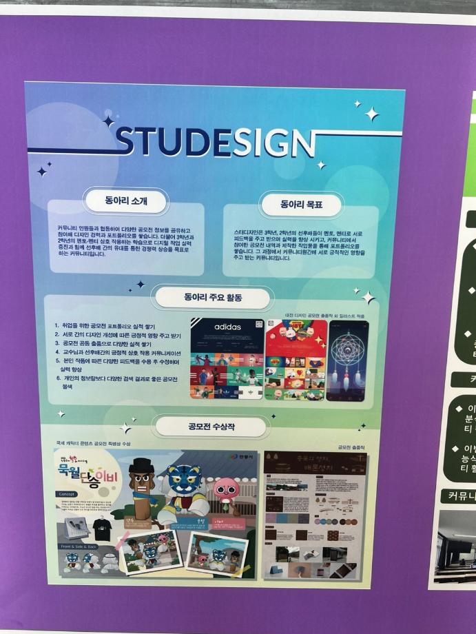 시각영상디자인학과 출신 임원이 진행하고 있으며 STUDESIGN, 디자인붐 등의 동아리가 참여하고 있습니다! 많이 관심과 참여 부탁드립니다.