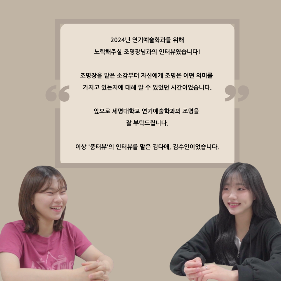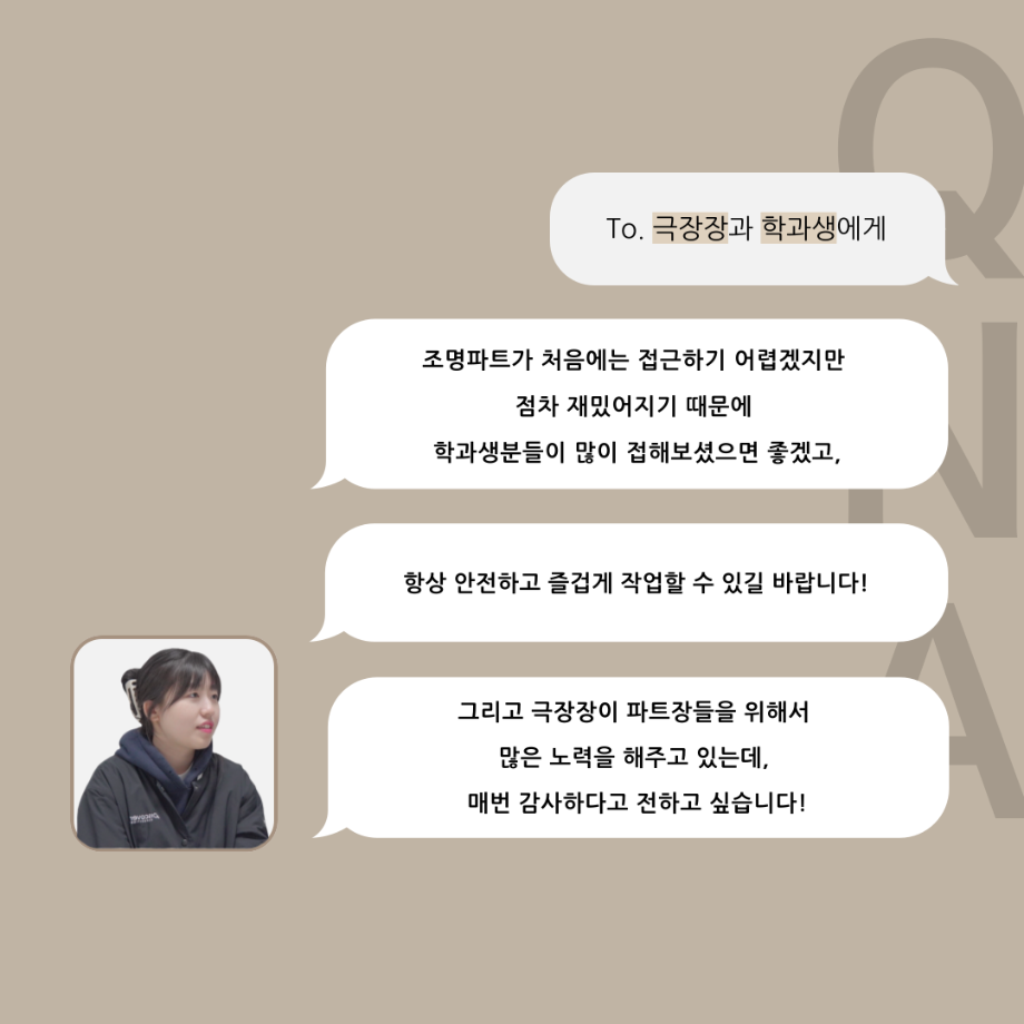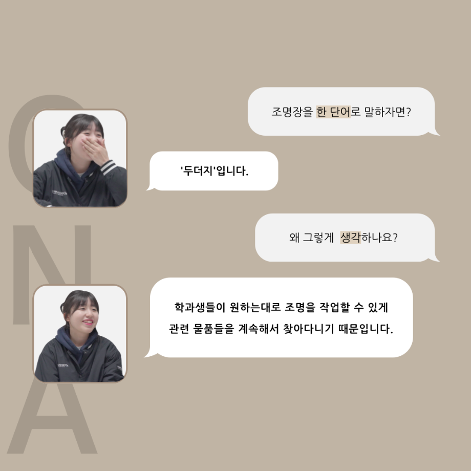 본문 시작 홈으로 커뮤니티 학과소개 입학정보 교수소개 학과과정 커뮤니티 공연예매 안내 홈페이지가이드 동아리 공지사항 포토갤러리 작품DB 동아리 학사일정 학생회 극장 스탭 동아리 무용 동아리 뮤지컬 동아리 극장 스탭 동아리 배우 훈련 동아리 극장 스탭 동아리 페이스북 트위터 프린트 ’품‘위있는 인’터뷰‘ - 24년도 조명장 <오승아> 연기예술학과 2417 2024-07-22 안녕하십니까. 24년도 학회 ‘품‘ 입니다. 학회 ‘품’의 다섯 번째 인터뷰로 세명대학교 연기예술학과 24학년도 조명장인 오승아 학우와 인터뷰 하는 시간을 가졌습니다. 조명장을 맡게된 소감과 조명은 어떤 의미가 있는지, 조명에서 조심히 해야하는 것은 무엇이며 극장장과 학과생에게 전하고 싶은 말 등을 질문하는 시간을 가졌습니다. 앞으로 있을 인터뷰 컨텐츠인 ‘품터뷰’ 많은 사랑 부탁드립니다. 목록 이전’품‘위있는 인’터뷰‘ - 24년도 무대장 <장보배> 다음 ’품‘위있는 인’터뷰‘ - 24년도 음향장 <임소정> 만족도조사 만족도 조사 이 페이지에서 제공하는 정보에 대하여 만족하시나요? 매우만족 만족 보통 불만족 매우불만족