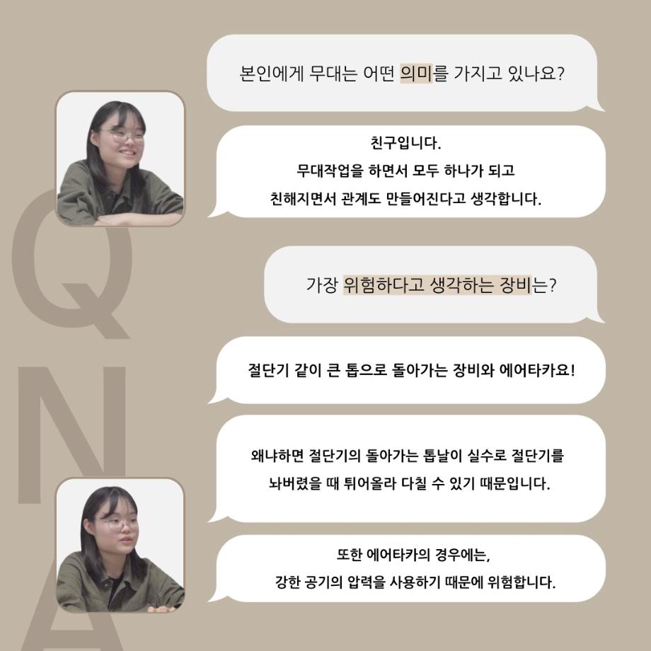 본문 시작 홈으로 커뮤니티 학과소개 입학정보 교수소개 학과과정 커뮤니티 공연예매 안내 홈페이지가이드 동아리 공지사항 포토갤러리 작품DB 동아리 학사일정 학생회 극장 스탭 동아리 무용 동아리 뮤지컬 동아리 극장 스탭 동아리 배우 훈련 동아리 극장 스탭 동아리 페이스북 트위터 프린트 ’품‘위있는 인’터뷰‘ - 24년도 무대장 <장보배> 연기예술학과 2491 2024-07-16 안녕하십니까. 24년도 학회 ‘품‘ 입니다. 학회 ‘품’의 네 번째 인터뷰로 세명대학교 연기예술학과 24학년도 무대장인 장보배 학우와 인터뷰 하는 시간을 가졌습니다. 무대장을 맡게된 소감과 무대는 어떤 의미가 있는지, 위험한 장비는 무엇이며 극장장과 학과생에게 전하고 싶은 말 등을 질문하는 시간을 가졌습니다. 앞으로 있을 인터뷰 컨텐츠인 ‘품터뷰’ 많은 사랑 부탁드립니다. 목록 이전’품‘위있는 인’터뷰‘ - 24년도 극장장 <이종화> 다음 ’품‘위있는 인’터뷰‘ - 24년도 조명장 <오승아> 만족도조사 만족도 조사 이 페이지에서 제공하는 정보에 대하여 만족하시나요? 매우만족 만족 보통 불만족 매우불만족