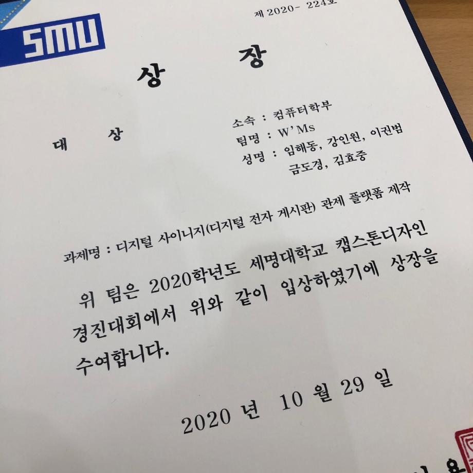 본문 시작 홈으로 학부활동 학부소개 학부활동 교육과정 커뮤니티 학부생활 입학안내 홈페이지가이드 전공 동아리 학부행사 학생회 활동 전공 동아리 학부갤러리 ICES Lab (Inteligent Computing Embedded System) DI Lab ICES Lab (Inteligent Computing Embedded System) ICES Lab (Inteligent Computing Embedded System) 페이스북 트위터 프린트 2020학년도 2학기 캡스톤 디자인 경진대회 "대상" 수상 컴퓨터학부 3222 2020-10-29 목록 다음 2022 지자체-대학 협력기반 지역혁신사업 캡스톤 경진대회 우수상 수상 만족도조사 만족도 조사 이 페이지에서 제공하는 정보에 대하여 만족하시나요? 매우만족 만족 보통 불만족 매우불만족