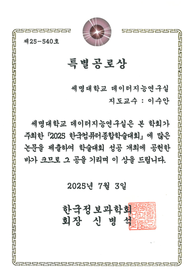 본문 시작 홈으로 학부활동 학부소개 학부활동 교육과정 커뮤니티 학부생활 입학안내 홈페이지가이드 전공 동아리 학부행사 학생회 활동 전공 동아리 학부갤러리 DI Lab DI Lab ICES Lab (Inteligent Computing Embedded System) DI Lab 페이스북 트위터 프린트 KCC2025 세명대학교 데이터지능연구실 (이수안 교수) 특별공로상 수상 컴퓨터학부 329 2025-09-05 2025 한국컴퓨터종합학술대회(KCC2025)에서 세명대학교 데이터지능연구실(이수안 교수)이 특별공로상을 수상하였습니다. 축하드립니다. 목록 이전컴퓨터학부 최윤성 학생 공정위, 프랜차이즈 데이터 활용 공모전 우수상 수상 다음 세명대학교 컴퓨터학부 데이터지능연구실, AI 진로 상담 연구로 2025 한국컴퓨터종합학술대회 우수상 수상 만족도조사 만족도 조사 이 페이지에서 제공하는 정보에 대하여 만족하시나요? 매우만족 만족 보통 불만족 매우불만족