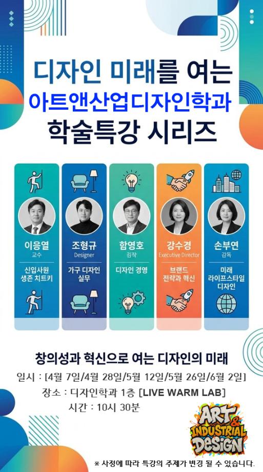 본문 시작 홈으로 학과생활 학과소개 교수소개 교과과정 학과생활 홈페이지가이드 학과행사 공지사항 사진게시판 전공자료실 동아리 학과행사 학과행사 페이스북 트위터 프린트 [학술특강] 2026학년도 1학기 학술특강 계획 아트앤산업디자인학과 25 2026-04-22 목록 이전[특강] 산업디자인 실무체험 학술특강 [가구디자인실무 &취업가이드] 만족도조사 만족도 조사 이 페이지에서 제공하는 정보에 대하여 만족하시나요? 매우만족 만족 보통 불만족 매우불만족