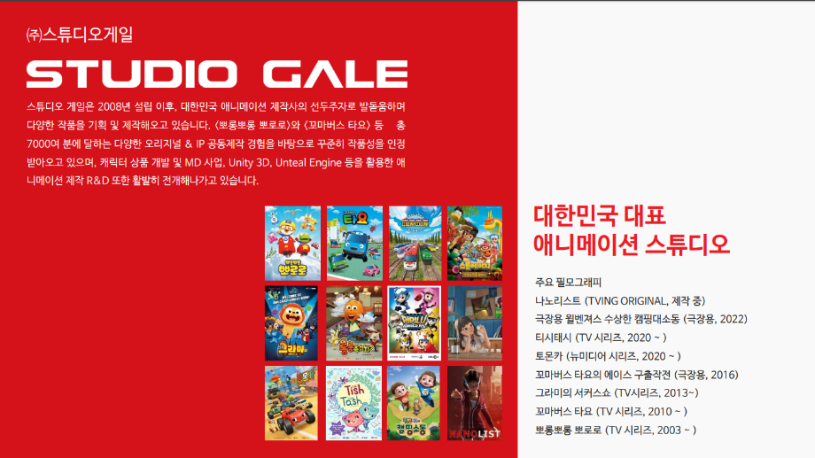 뽀로로, 꼬마버스타요 등 한국 애니메이션사에 획을 긋는 애니메이션을 발표한, 스튜디오 게일의 신창환 대표를 모시고, 한국 애니메이션 산업의 발전과, 현재 스튜디오 게일의 야심찬 애니메이션 산업의 계획등을 자세히 듣는 시간을 갖고자 합니다.