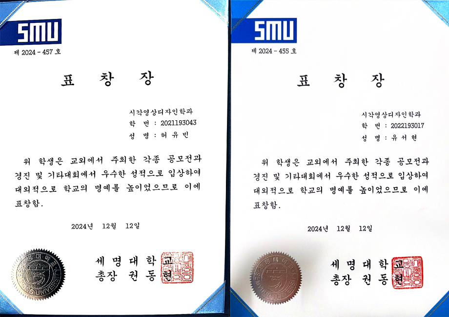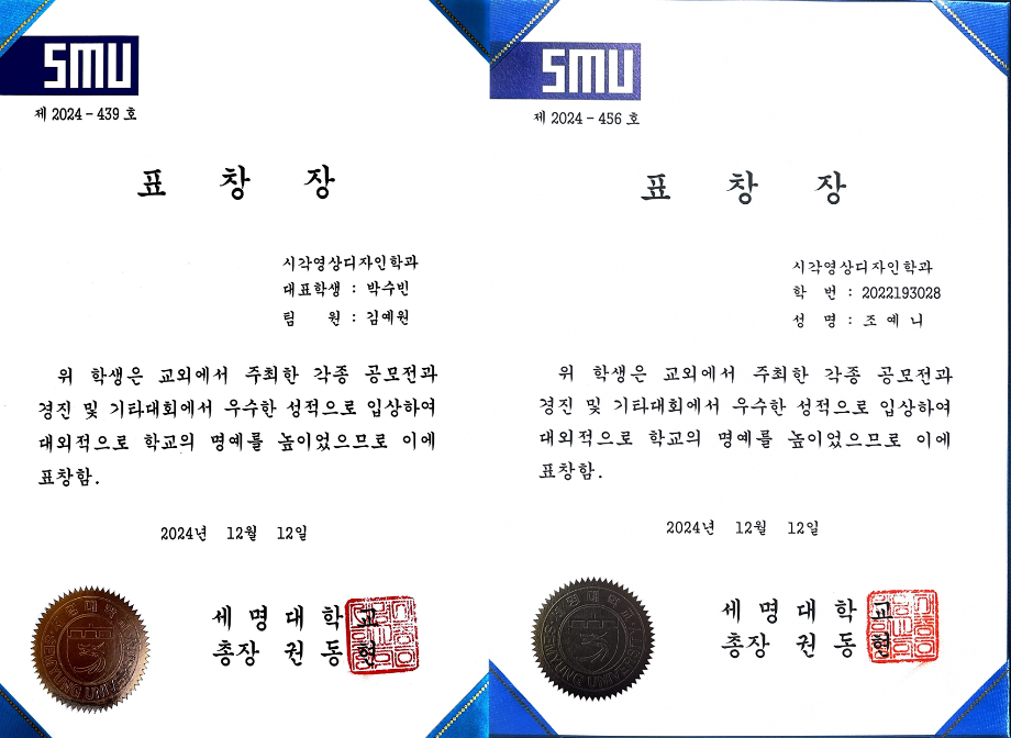 본문 시작 홈으로 시영소식 학과소개 학과과정 시영소식 입학/취업 AI 학과자랑 SNS소통 홈페이지가이드 학과행사 공지사항 학과행사 공모전 학생 인터뷰 학과행사 페이스북 트위터 프린트 2024학년도 2학기 총장표창 수여식 시각영상디자인학과 1822 2024-12-20 우리학과에서 5명이 대외수상 분야로 수상하였습니다 축하합니다~ 4학년 - 김예원, 허유빈, 박수빈 3학년 - 조예니, 유서현 목록 이전세명고 전공체험(12.18.수) 다음 AI 콘텐츠연구소 전시 안내 담당부서 : 시각영상디자인학과 담당자 : - 연락처 : 043-649-1726 최종수정일 : 2024-10-26 만족도조사 만족도 조사 이 페이지에서 제공하는 정보에 대하여 만족하시나요? 매우만족 만족 보통 불만족 매우불만족