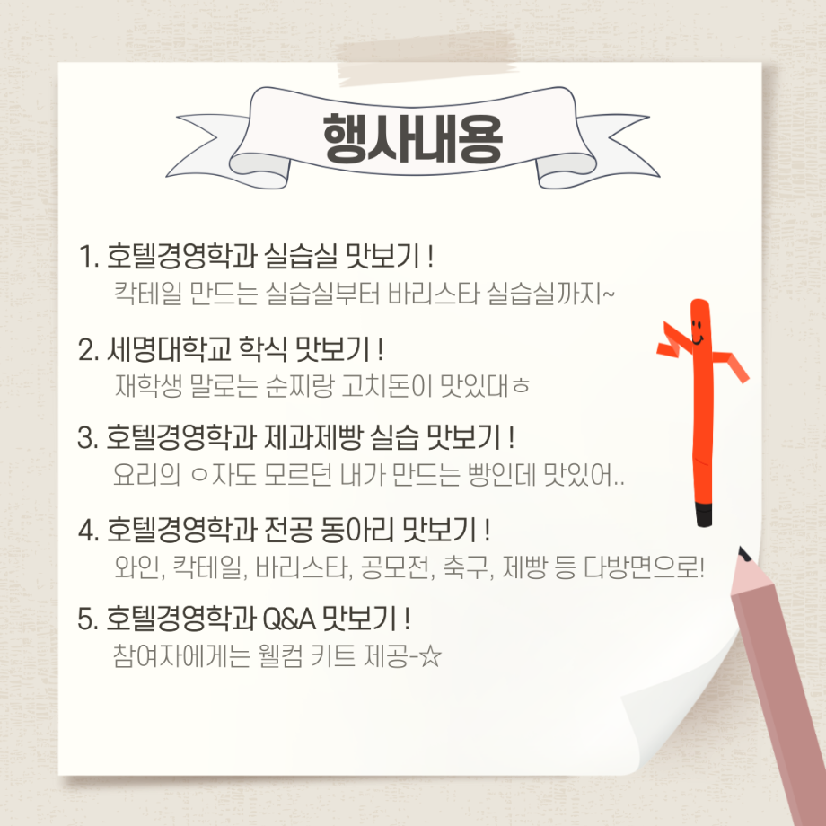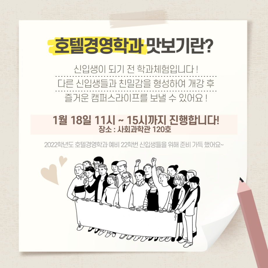 본문 시작 홈으로 학과소개 커뮤니티 학과소개 교육 홈페이지가이드 학과행사 학과장인사말 교수소개 학과행사 학과행사 페이스북 트위터 프린트 2022년 호텔경영학과 지원 수험생 대상 맛보기 행사 호텔경영학과 2005 2022-01-18 2022학년도 호텔경영학과 맛보기 행사 1. 행사 일정 : 2022년 1월 18일(화)_사회과학관 120호 2. 행사 시간 : 오전 11시 ~ 오후 3시 3. 행사 대상 : 2022학년도 호텔경영학과 예비 22학번 4. 행사 내용 - 호텔경영학과 실습실 맛보기 ! - 세명대학교 학식 맛보기 ! - 호텔경영학과 제과제빵 실습 맛보기 ! - 호텔경영학과 전공 동아리 맛보기 ! - 호텔경영학과 Q&A 맛보기 ! * 참여자에게 웰컴키트 제공 ! 목록 다음 2021년 재학생 행사 만족도조사 만족도 조사 이 페이지에서 제공하는 정보에 대하여 만족하시나요? 매우만족 만족 보통 불만족 매우불만족