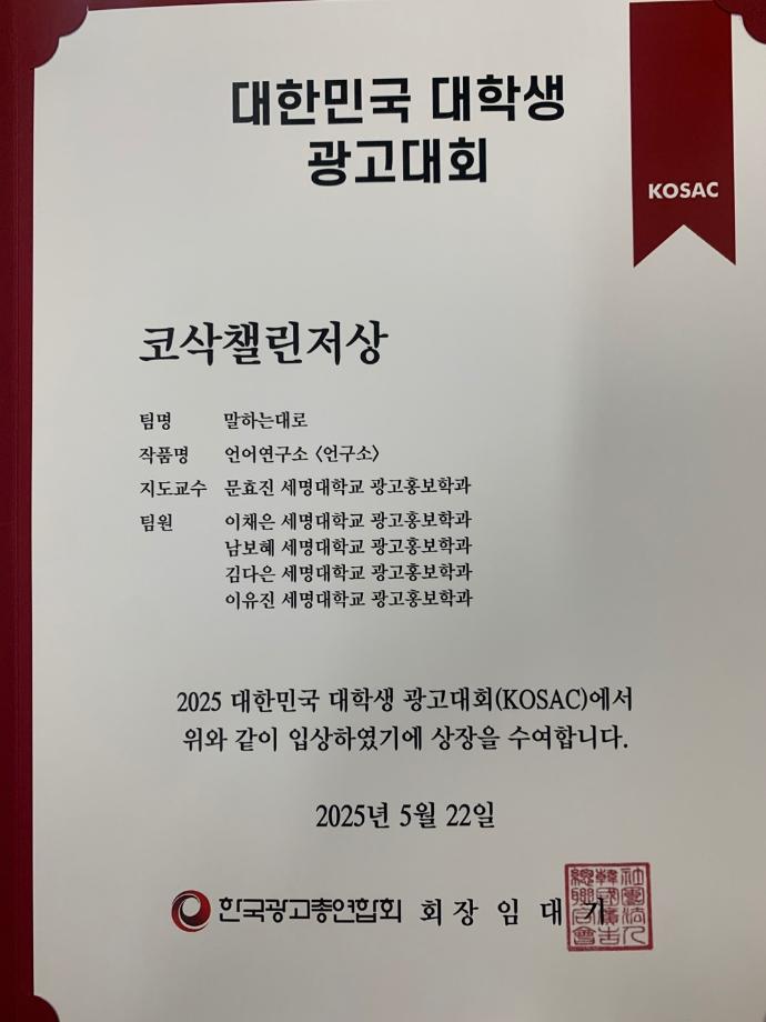 본문 시작 홈으로 매력적인 학과소개 매력적인 학과소개 흥미로운 교육과정 특별CC프로그램 We can 취업 따뜻한 커뮤니티 홈페이지가이드 지금 우리 광홍은 학과개요 학과연혁 교수소개 Wilco로 보는광고홍보학과 지금 우리 광홍은 지금 우리 광홍은 페이스북 트위터 프린트 2025KOSAC_트로피_상장 광고홍보학과 1213 2025-08-01 <2025년 대한민국 대학생 광고대회>에서 좋은 성적을 거둔 우리 학생들 축하해요. ^^ 금상 트로피가 학과에 왔네요. 그리고 챌린저상 수상 소식도 계속 들려오고 있네요. 모든 학생들의 열정과 노력에 감사합니다. : ) *크리에이티브 기획맛집 세명대 광고홍보학과! 목록 이전[경축]2025 KOSAC 전국대회 금상 다음 2025 Creative Challenge 공모전