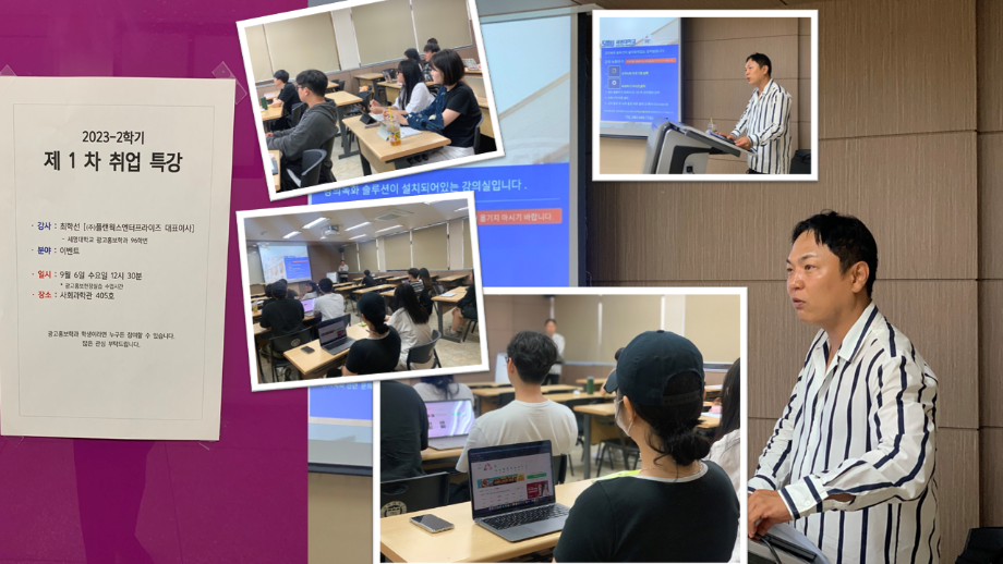 본문 시작 홈으로 매력적인 학과소개 매력적인 학과소개 흥미로운 교육과정 특별CC프로그램 We can 취업 따뜻한 커뮤니티 홈페이지가이드 지금 우리 광홍은 학과개요 학과연혁 교수소개 Wilco로 보는광고홍보학과 지금 우리 광홍은 지금 우리 광홍은 페이스북 트위터 프린트 [취업특강1탄] 광고홍보학과 5637 2023-09-11 23학년도 2학기 취업특강 제1탄 BTL 전문회사 '플랜웍스엔터프라이즈' _일시 : 2023년 9월 6일(수), 12:30~ _장소 : 사회과학관 405호 _내용 : BTL, 이벤트, 프로모션 산업계 현황 및 취업 노하우 _강사 : 플랜웍스엔터프라이즈 최학선(대표이사) * 특강 후 1:1 취업 면담도 진행했습니다. 이벤트 분야 취업을 희망하는 학생은 추후라도 연락주시면 취업을 돕겠습니다. : ) 목록 이전[국제광고대회참가] 다음 [취업특강2탄]