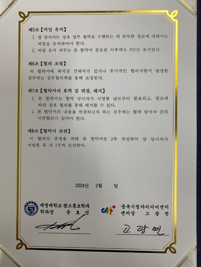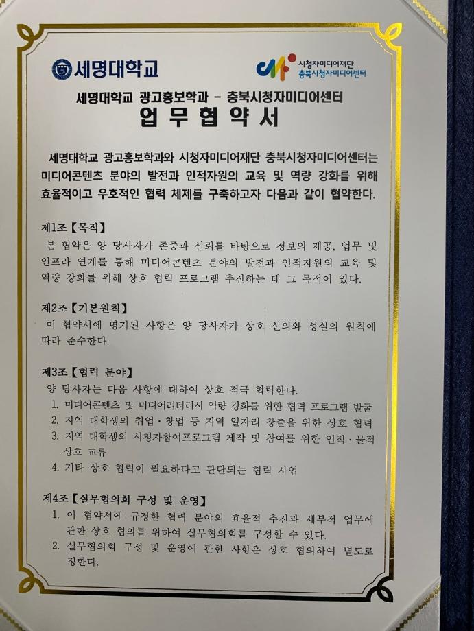 본문 시작 홈으로 매력적인 학과소개 매력적인 학과소개 흥미로운 교육과정 특별CC프로그램 We can 취업 따뜻한 커뮤니티 홈페이지가이드 지금 우리 광홍은 학과개요 학과연혁 교수소개 Wilco로 보는광고홍보학과 지금 우리 광홍은 지금 우리 광홍은 페이스북 트위터 프린트 [충북시청자미디어센터-세명대광고홍보학과] 업무협약 체결 광고홍보학과 3221 2024-07-17 <충북시청자미디어센터>와 <세명대 광고홍보학과> 업무협약식 개최 지역 미디어 콘텐츠 분야의 발전과 광고홍보 전문인력양성지원을 위해 큰 우군을 얻었습니다. ^^ '세명대 광고홍보학과'는 광고와 다양한 콘텐츠를 위한 [기획 맛집]을 넘어 [영상제작 맛집]을 향해 갑니다. 목록 이전[학과홍보]지금 우리 광홍은! 다음 [공동교육과정]단양/제천 소재 고교생 대상 광고/마케팅 특강