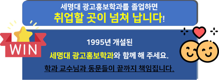 본문 시작 홈으로 매력적인 학과소개 매력적인 학과소개 흥미로운 교육과정 특별CC프로그램 We can 취업 따뜻한 커뮤니티 홈페이지가이드 지금 우리 광홍은 학과개요 학과연혁 교수소개 Wilco로 보는광고홍보학과 지금 우리 광홍은 지금 우리 광홍은 페이스북 트위터 프린트 [취업현황]우리 광홍 취업은 광고홍보학과 3521 2024-09-13 우리 광홍은 취업률이 좋습니다. 최근 취업률이 70% 이상을 기록하고 있습니다. * 1995년 개설된 '역사'와 '전통', '역량'을 가진 우리 광홍 여러분의 취업과 성공을 학과는 기도하고 돕겠습니다. "기획맛집" 세명대 광고홍보학과!! 기획력이 경쟁력이다~. 목록 이전[수상]2024코삭챌린저상 다음 [경축]2025대한민국 대학생 광고대회 '최우수상'수상_대전충청지역대회