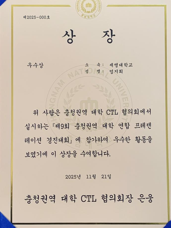 본문 시작 홈으로 매력적인 학과소개 매력적인 학과소개 흥미로운 교육과정 특별CC프로그램 We can 취업 따뜻한 커뮤니티 홈페이지가이드 지금 우리 광홍은 학과개요 학과연혁 교수소개 Wilco로 보는광고홍보학과 지금 우리 광홍은 지금 우리 광홍은 페이스북 트위터 프린트 25학번 엄지희_충청권역 대학 연합 프레젠테이션_우수상 광고홍보학과 1003 2025-11-24 우리 광고홍보학과 25학번 엄지희 학생이 '제9회 충청권역 대학 연합 프레젠테이션 경진대회'에서 우수상을 수상했어요. ^^ 훌륭하고, 대견합니다. 진심으로 축하합니다. '기획 맛집' 세명대 광고홍보학과!!! '발표 맛집' 까지... 목록 이전2025-2학기 개강총회 다음 새해 복 많이 받으세요 : )
