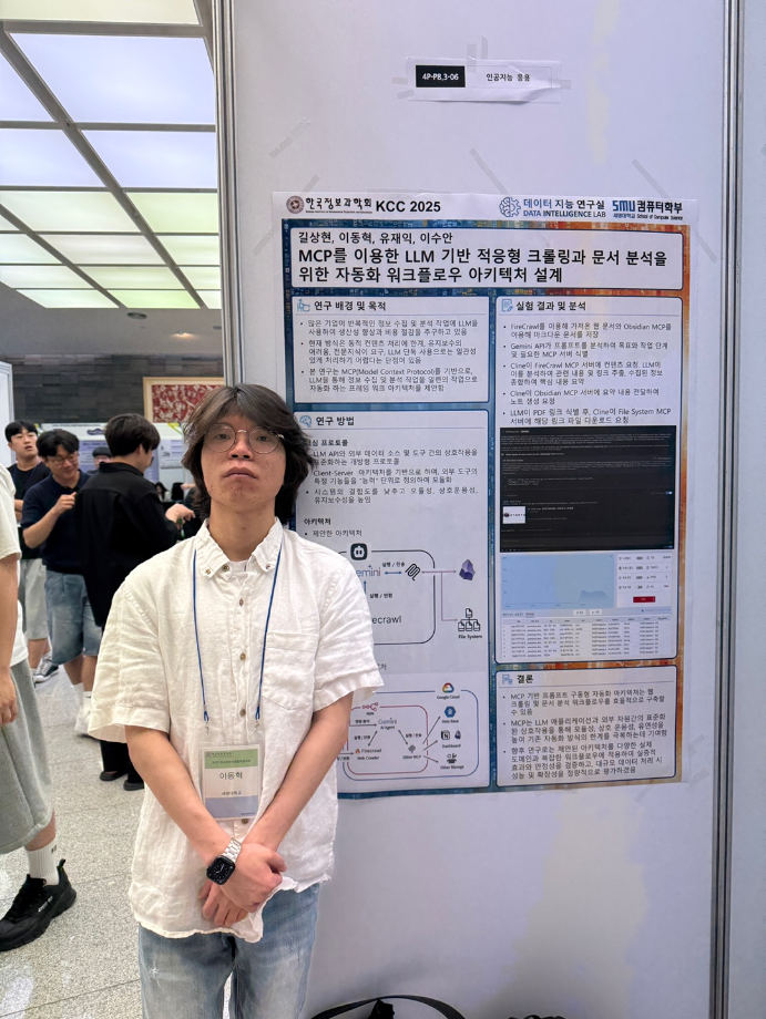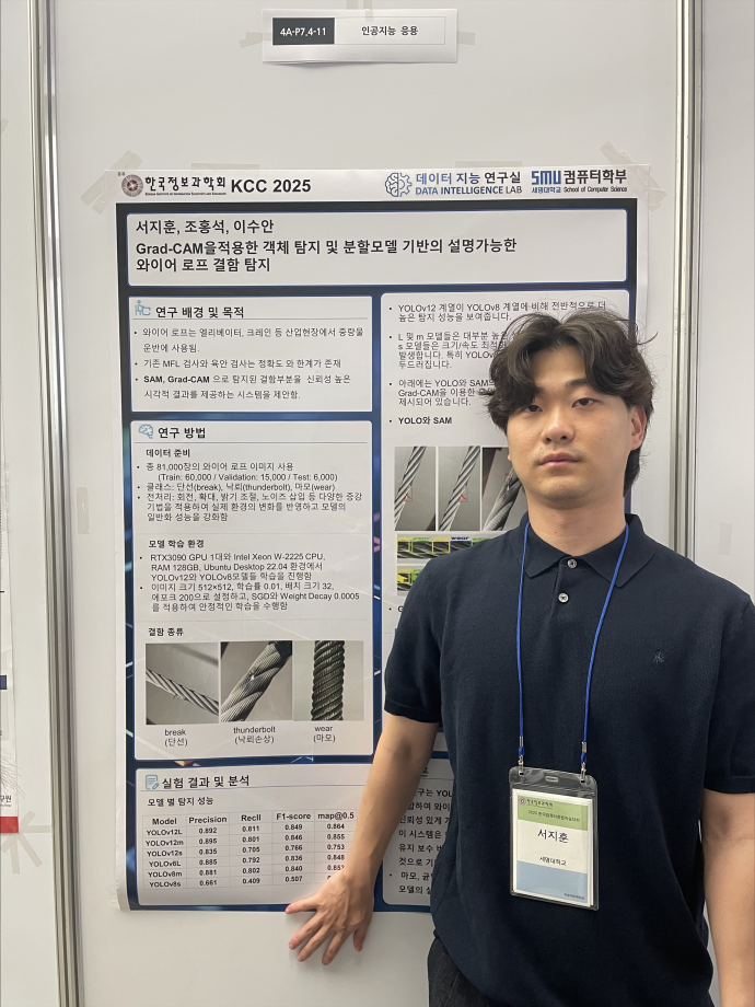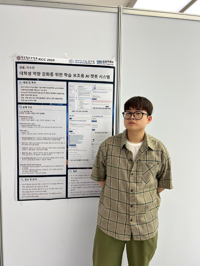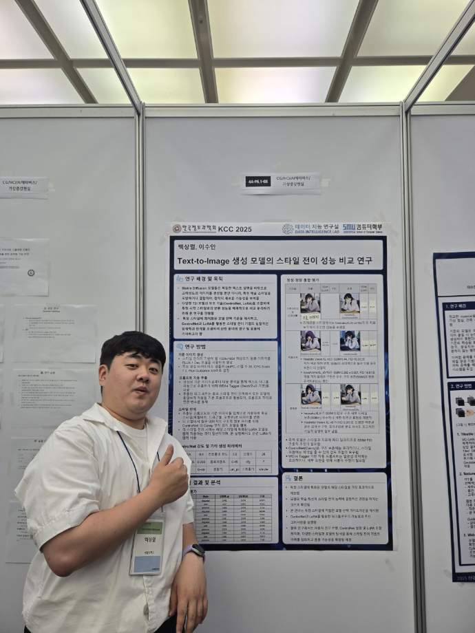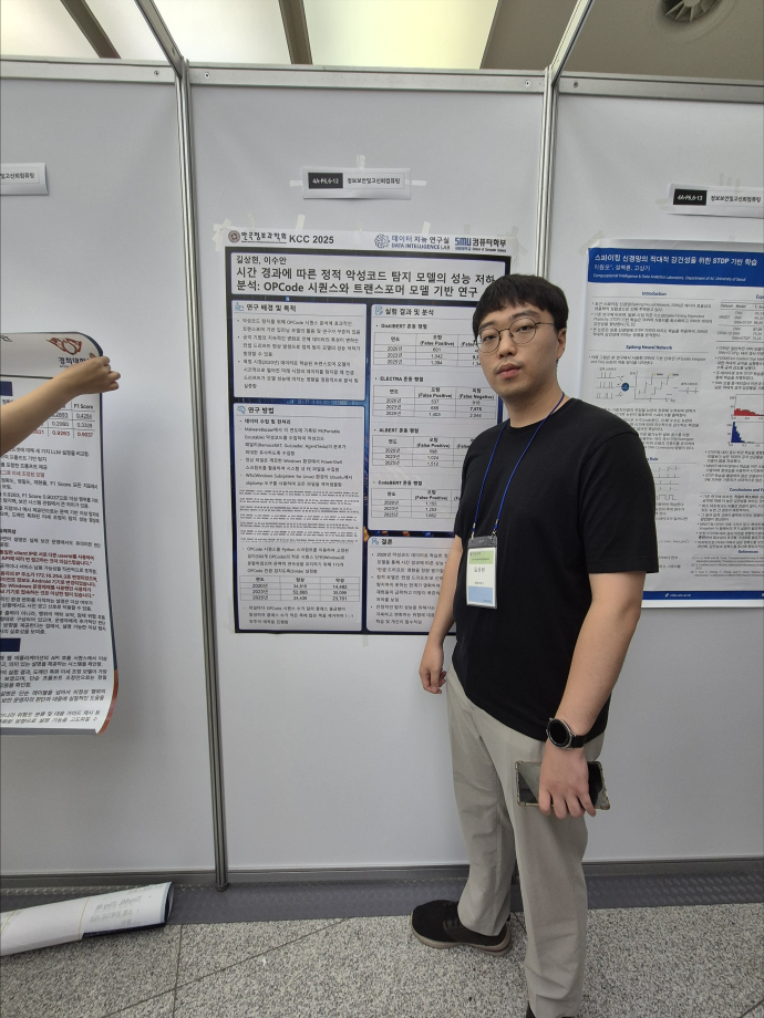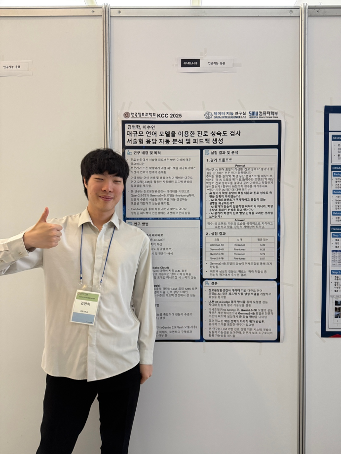 본문 시작 홈으로 학부활동 학부소개 학부활동 교육과정 커뮤니티 학부생활 입학안내 홈페이지가이드 학부행사 학부행사 학생회 활동 전공 동아리 학부갤러리 학부행사 페이스북 트위터 프린트 2025 한국컴퓨터종합학술대회 논문 발표 참가 - 1 컴퓨터학부 768 2025-07-09 국내 컴퓨터분야 최대 학술대회인 2025 한국컴퓨터종합학술대회 논문 발표에 참여한 고상근, 권용, 길상현, 김남현, 김동후, 김병학, 김재성, 박주성, 백상렬, 서지훈, 우강석, 이동혁 학생입니다. 모두 고생하셨습니다! 목록 이전세명대학교 컴퓨터학부 2025-1학기 단체봉사 다음 2025 한국컴퓨터종합학술대회 논문 발표 참가 - 2 만족도조사 만족도 조사 이 페이지에서 제공하는 정보에 대하여 만족하시나요? 매우만족 만족 보통 불만족 매우불만족