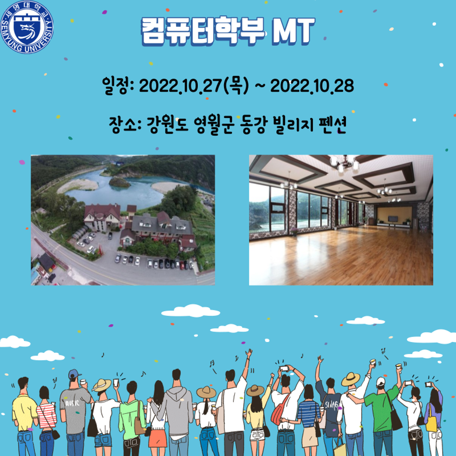 세명대학교 컴퓨터학부에서 진행하는 MT는 10월 27일에서 28일까지 강원도 영월군 동강 빌리지 펜션에서 이루어집니다.