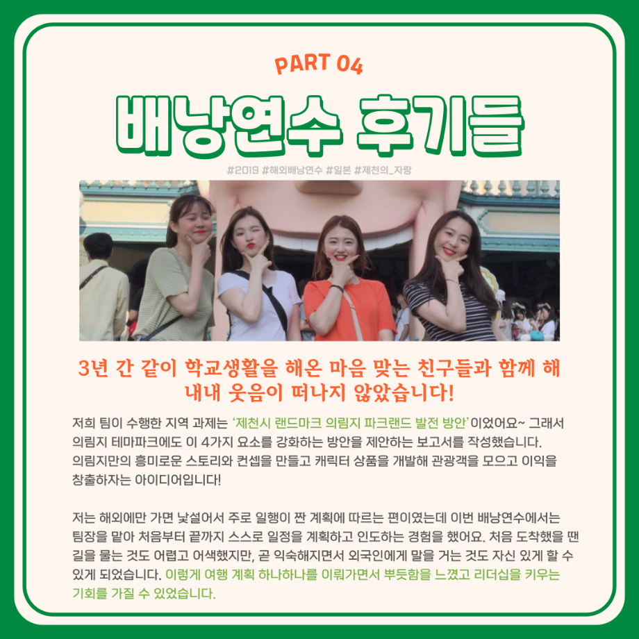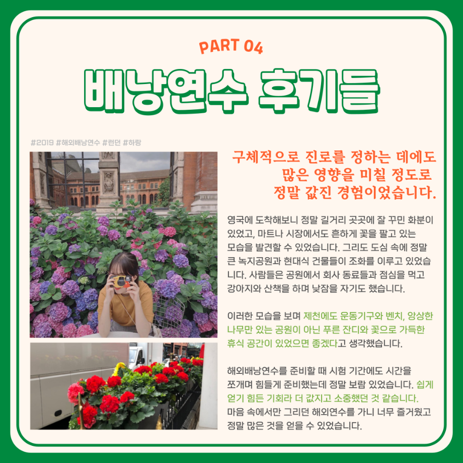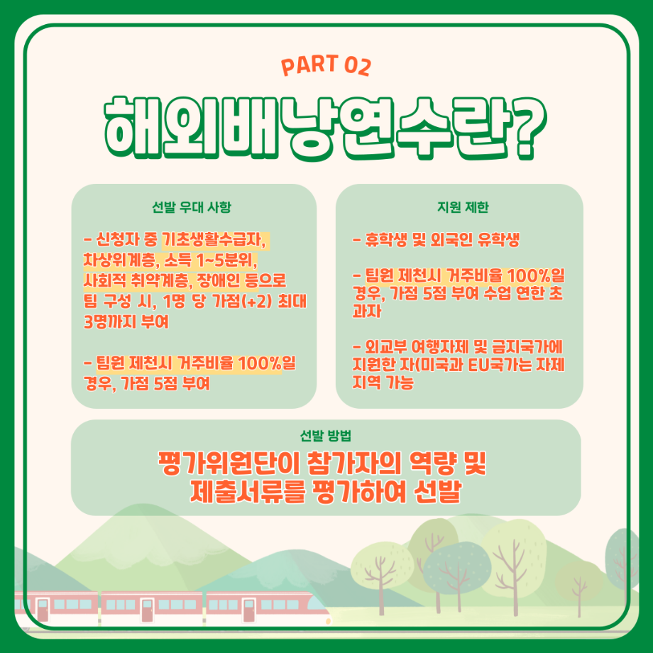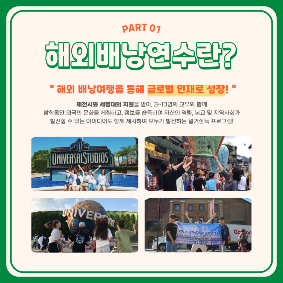 본문 시작 홈으로 학부활동 학부소개 학부활동 교육과정 커뮤니티 학부생활 입학안내 홈페이지가이드 학부행사 학부행사 학생회 활동 전공 동아리 학부갤러리 학부행사 페이스북 트위터 프린트 세명대학교 해외배낭연수 안내 컴퓨터학부 2726 2023-11-17 세명대학교 해외배낭연수 제천시와 세명대의 지원을 받아 3~10명의 교우와 함께 방학동안 외국의 문화를 체험하고, 정보를 습득하여 자신의 역량, 본교 및 지역사회가 발전할 수 있는 아이디어도 함께 제시하여 모두가 발전하는 일거삼득 프로그램, 해외배낭연수! 본교 학부 재학생이며, 제천시에 주소를 두고 있는 이들을 대상으로 진행 되는 프로그램이며 선발우대사항, 지원 제한, 선발 방법 등 보다 자세한 내용은 세명대학교 포털 공지사항에서 확인해주세요. 목록 이전🌾세명대학교 컴퓨터학부 단체봉사활동🌾 다음 재학생을 위한 과일나눔 이벤트 6차 '비타민DAY' 시행 안내 만족도조사 만족도 조사 이 페이지에서 제공하는 정보에 대하여 만족하시나요? 매우만족 만족 보통 불만족 매우불만족