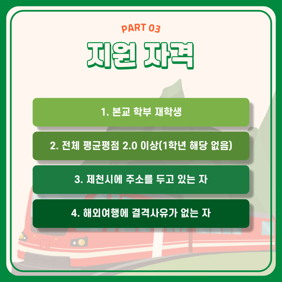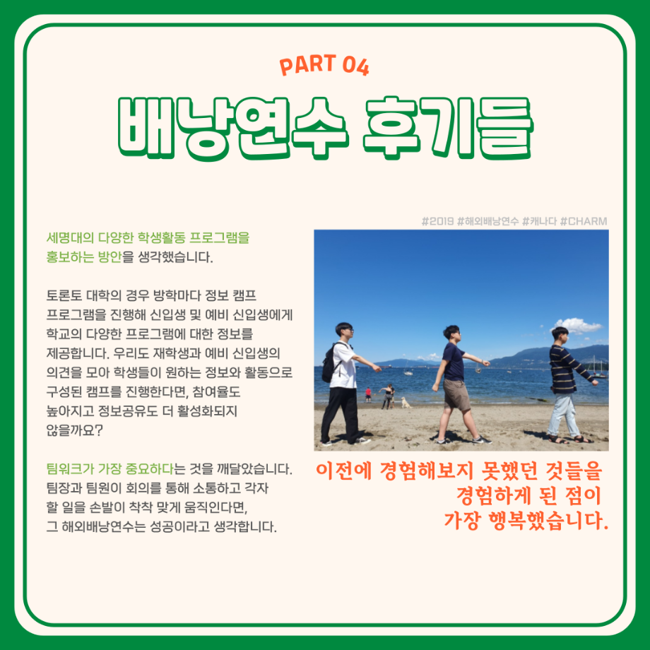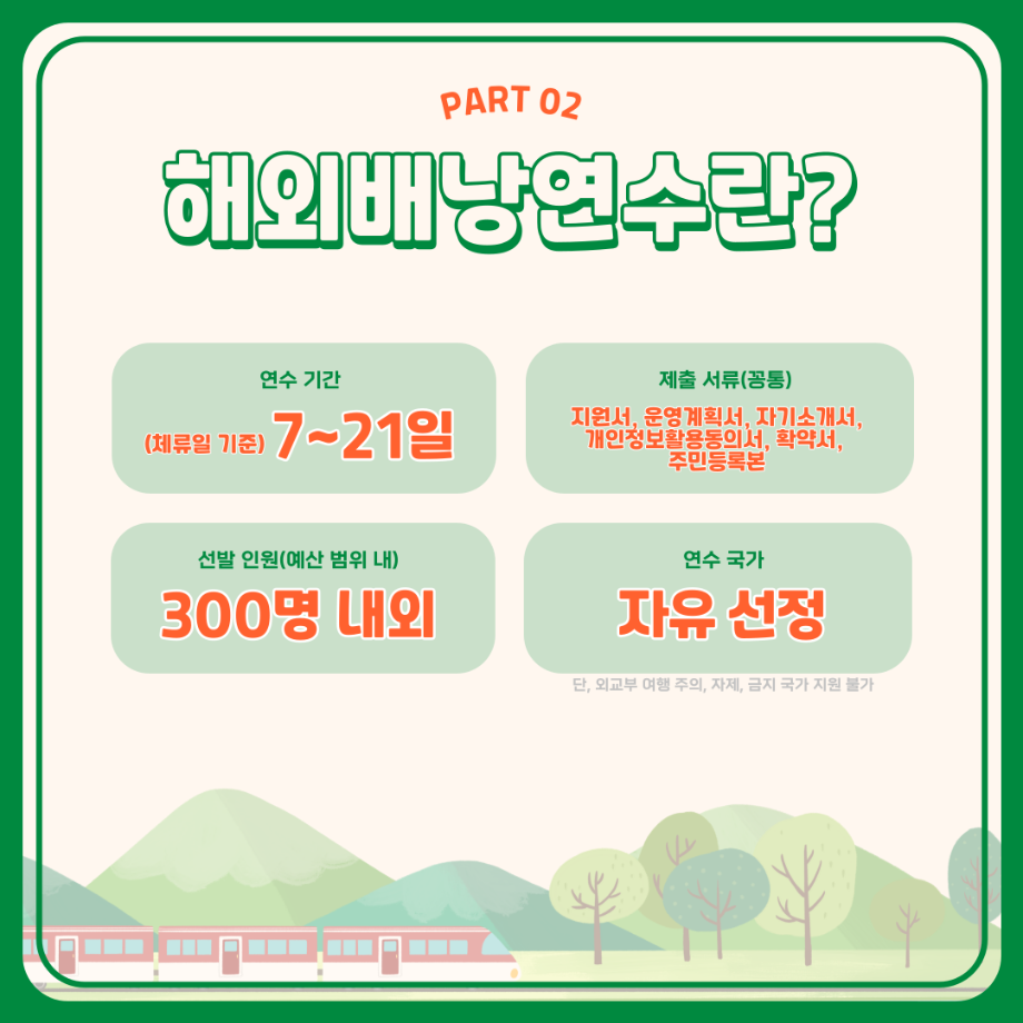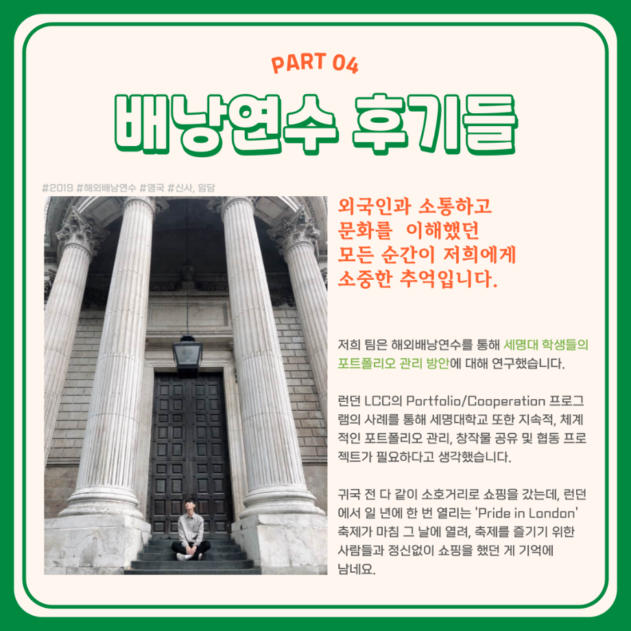 본문 시작 홈으로 학부활동 학부소개 학부활동 교육과정 커뮤니티 학부생활 입학안내 홈페이지가이드 학부행사 학부행사 학생회 활동 전공 동아리 학부갤러리 학부행사 페이스북 트위터 프린트 세명대학교 해외배낭연수 안내 컴퓨터학부 2726 2023-11-17 세명대학교 해외배낭연수 제천시와 세명대의 지원을 받아 3~10명의 교우와 함께 방학동안 외국의 문화를 체험하고, 정보를 습득하여 자신의 역량, 본교 및 지역사회가 발전할 수 있는 아이디어도 함께 제시하여 모두가 발전하는 일거삼득 프로그램, 해외배낭연수! 본교 학부 재학생이며, 제천시에 주소를 두고 있는 이들을 대상으로 진행 되는 프로그램이며 선발우대사항, 지원 제한, 선발 방법 등 보다 자세한 내용은 세명대학교 포털 공지사항에서 확인해주세요. 목록 이전🌾세명대학교 컴퓨터학부 단체봉사활동🌾 다음 재학생을 위한 과일나눔 이벤트 6차 '비타민DAY' 시행 안내 만족도조사 만족도 조사 이 페이지에서 제공하는 정보에 대하여 만족하시나요? 매우만족 만족 보통 불만족 매우불만족