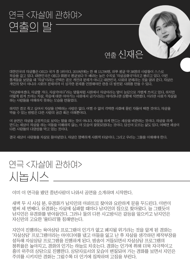 본문 시작 홈으로 학과과정 학과소개 입학정보 교수소개 학과과정 커뮤니티 공연예매 안내 홈페이지가이드 비교과프로그램 교육과정 전공교육 체계도 비교과프로그램 MOU 체결 하계, 동계 프로젝트 하계, 동계 프로젝트 연극놀이 지도사 양성 교육 현장실습 프로그램 액팅플러스 하계, 동계 프로젝트 페이스북 트위터 프린트 2021학년도 동계 프로젝트 ‘자살에 관하여’ 연기예술학과 2482 2021-03-26 목록 다음 2021학년도 동계 프로젝트 ‘넥스트 투 노멀’ 다음 2021학년도 동계 프로젝트 ‘오아시스 세탁소 습격사건’ 만족도조사 만족도 조사 이 페이지에서 제공하는 정보에 대하여 만족하시나요? 매우만족 만족 보통 불만족 매우불만족