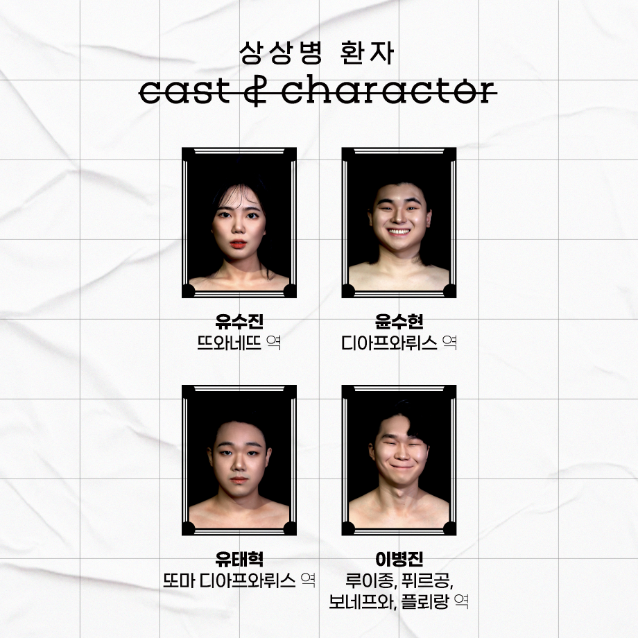 본문 시작 홈으로 학과과정 학과소개 입학정보 교수소개 학과과정 커뮤니티 공연예매 안내 홈페이지가이드 비교과프로그램 교육과정 전공교육 체계도 비교과프로그램 MOU 체결 하계, 동계 프로젝트 하계, 동계 프로젝트 연극놀이 지도사 양성 교육 현장실습 프로그램 액팅플러스 하계, 동계 프로젝트 페이스북 트위터 프린트 '동계 프로젝트 - 끝서리' 스틸컷 연기예술학과 3390 2022-02-11 ❄️ 제 80회 세명대학교 연기예술학과 정기공연 - 동계 프로젝트 '끝서리' 첫 번째 작품 <상상병 환자> 캐스팅 보드 ❄️ - 첫번째 작품 | 상상병 환자 두번째 작품 | R.U.R 세섯번째 작품 | 그 여자들, 다시 통닭을 먹다 - 본 공연은 방역 수칙을 준수하여 준비하였습니다. 여러분의 많은 관심과 참여 부탁드립니다. 목록 이전'동계 프로젝트 - 끝서리' 스틸컷 다음 '동계 프로젝트 - 끝서리' 스틸컷 만족도조사 만족도 조사 이 페이지에서 제공하는 정보에 대하여 만족하시나요? 매우만족 만족 보통 불만족 매우불만족