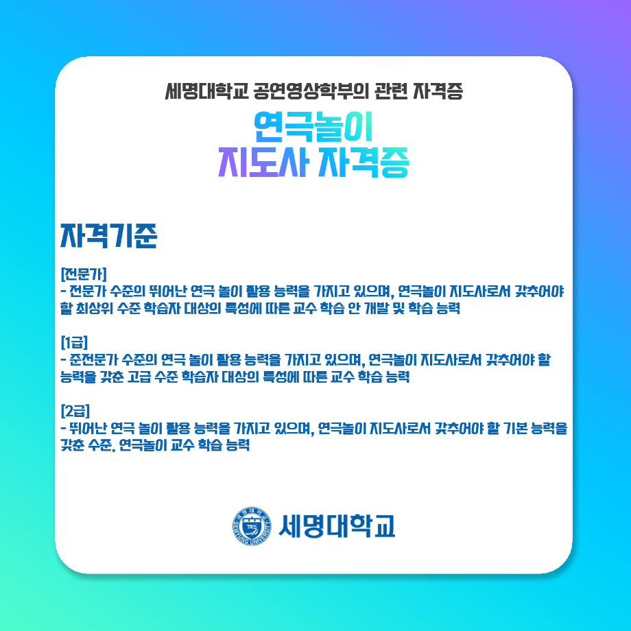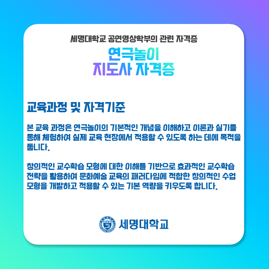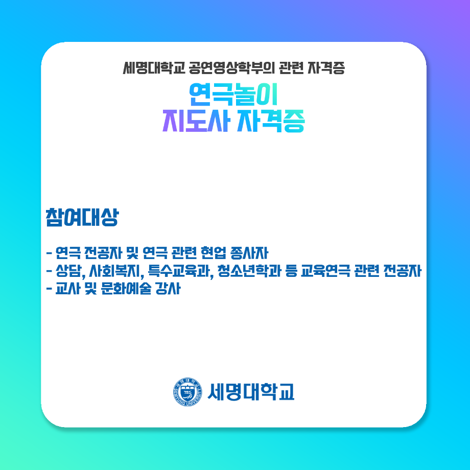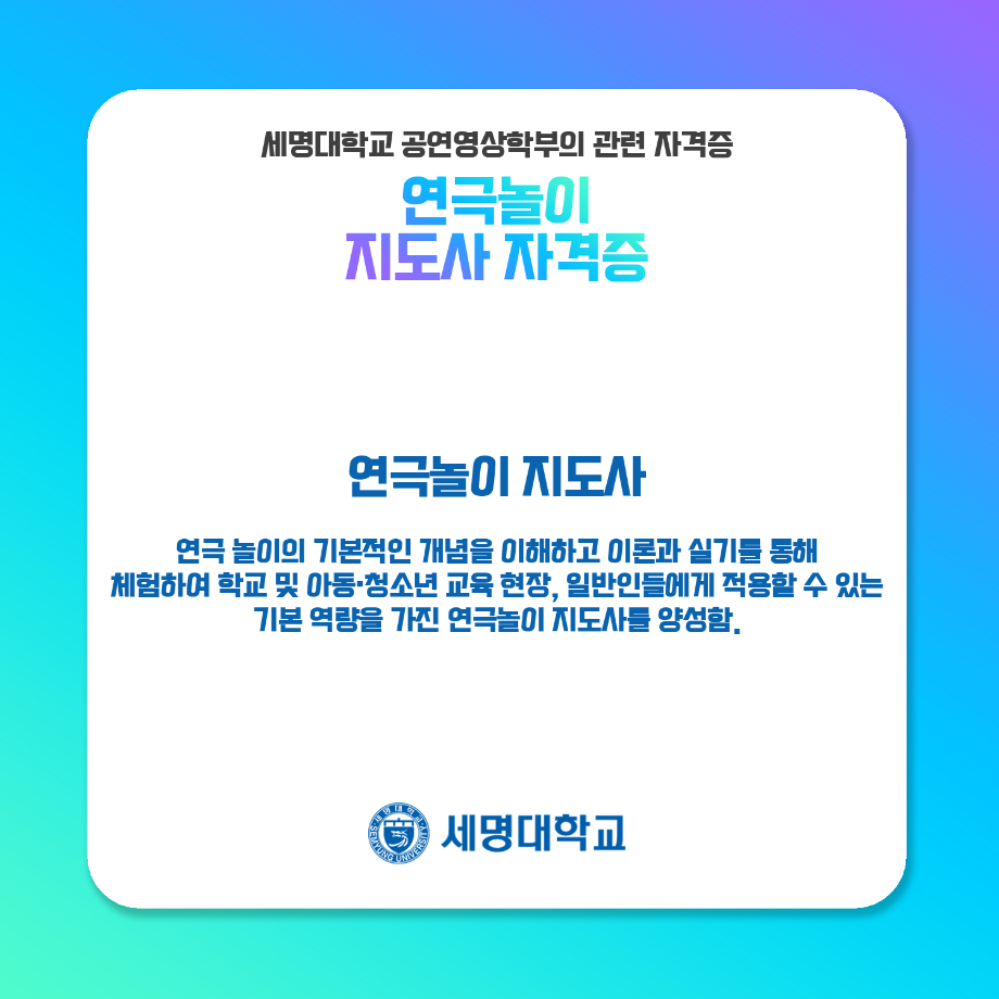 본문 시작 홈으로 학과과정 학과소개 입학정보 교수소개 학과과정 커뮤니티 공연예매 안내 홈페이지가이드 비교과프로그램 교육과정 전공교육 체계도 비교과프로그램 MOU 체결 연극놀이 지도사 양성 교육 하계, 동계 프로젝트 연극놀이 지도사 양성 교육 현장실습 프로그램 액팅플러스 연극놀이 지도사 양성 교육 페이스북 트위터 프린트 연극놀이 지도사 자격증 연기예술학과 4541 2022-01-15 세명대학교 연기예술학과에서는 학과생들을 위하여 매년 연극놀이지도사 자격증 취득을 위한 교육을 지원하고 있습니다. ㅤㅤ 한국임상연극심리치료협회의 지도하에 많은 학생들이 교육 과정을 이수하여 100%의 합격률을 자랑하고 있는 연극놀이지도사 자격증에 대하여 알려드립니다! 목록 다음 무대예술 전문인 자격증 만족도조사 만족도 조사 이 페이지에서 제공하는 정보에 대하여 만족하시나요? 매우만족 만족 보통 불만족 매우불만족