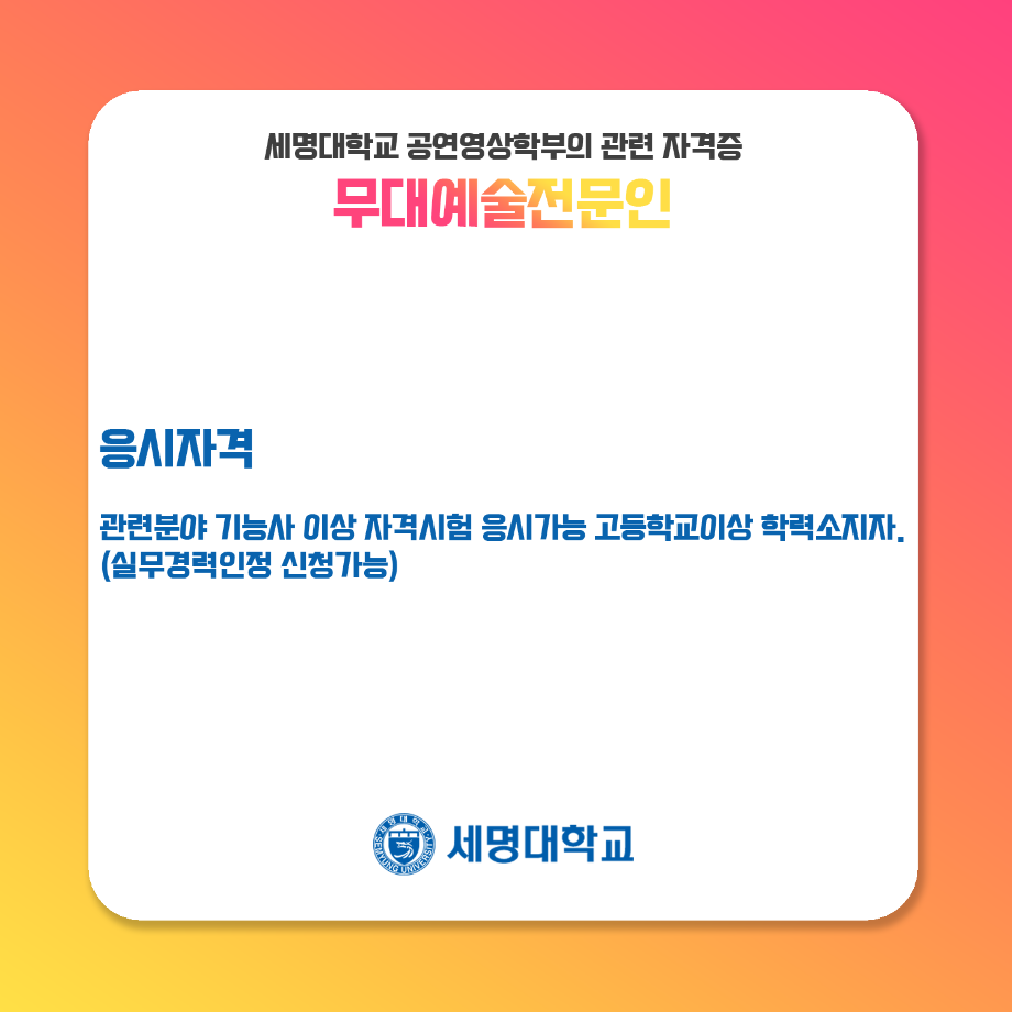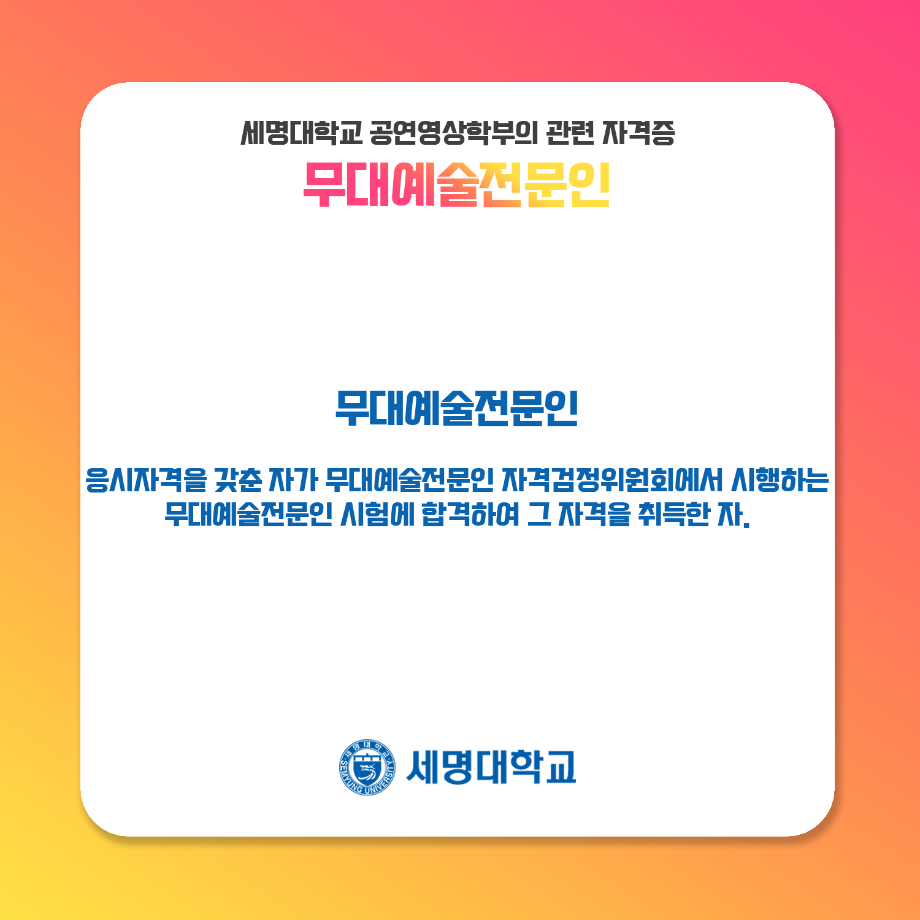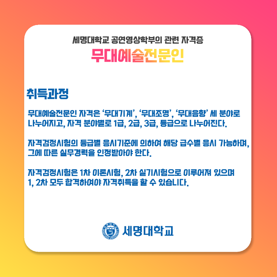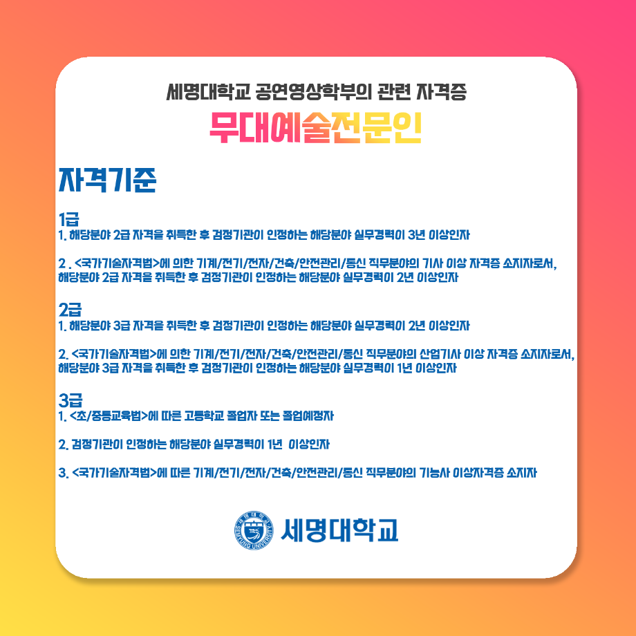 본문 시작 홈으로 학과과정 학과소개 입학정보 교수소개 학과과정 커뮤니티 공연예매 안내 홈페이지가이드 비교과프로그램 교육과정 전공교육 체계도 비교과프로그램 MOU 체결 연극놀이 지도사 양성 교육 하계, 동계 프로젝트 연극놀이 지도사 양성 교육 현장실습 프로그램 액팅플러스 연극놀이 지도사 양성 교육 페이스북 트위터 프린트 무대예술 전문인 자격증 연기예술학과 4271 2022-01-16 세명대학교 연기예술학과에서는 학과생을 위하여 매년 무대예술전문인 자격증 취득을 위한 교육을 지원하고 있습니다. ㅤㅤ 제 1전공뿐만이 아닌 학부와 관련된 다양한 전공을 경험하면서 스탭 분야별(무대, 조명, 음향)로 전공 지식을 함양함과 동시에 초대 강사님들의 지도하에 많은 학생들이 교육 과정을 이수하고 있습니다! 목록 이전연극놀이 지도사 자격증 이전연극놀이 지도사 양성 교육 1일차 활동 사진 만족도조사 만족도 조사 이 페이지에서 제공하는 정보에 대하여 만족하시나요? 매우만족 만족 보통 불만족 매우불만족