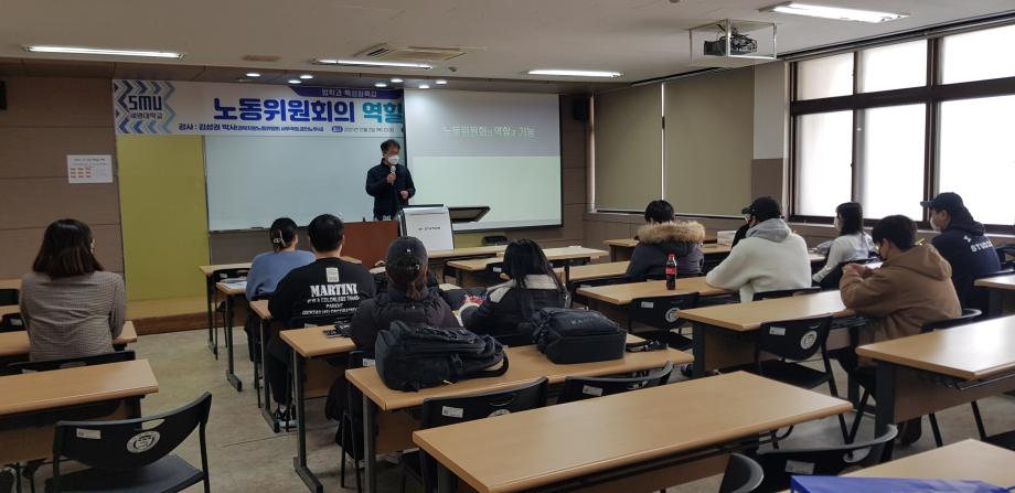 본문 시작 홈으로 학과과정 학과안내 교수소개 학과과정 커뮤니티 홈페이지가이드 비교과프로그램 교육과정 전공교육 체계도 대학원 법학과 비교과프로그램 학사일정 기업법무 지원프로그램 공공법무 지원프로그램 기업법무 지원프로그램 기업법무 지원프로그램 페이스북 트위터 프린트 2021. 12. 2. 노무사 특강 법학과 2960 2021-12-02 2021년 12월 2일 경북지방노동위원회 사무국장을 맡고 계시는 김성권 노무사님을 모시고 ' 노동위원회의 역할과 기능' 이라는 주제로 특강을 진행하였습니다. ※본 특강은 코로나19 방역 수칙을 준수하여 진행하였습니다.※ 목록 다음 2021 12. 3. 신변보호사 자격증(2차) 이전2021. 11. 26. 신변보호사 자격증(1차) 담당부서 : 법학과 담당자 : - 연락처 : 043-649-1764 최종수정일 : 2024-10-26 만족도조사 만족도 조사 이 페이지에서 제공하는 정보에 대하여 만족하시나요? 매우만족 만족 보통 불만족 매우불만족