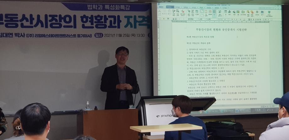 본문 시작 홈으로 학과과정 학과안내 교수소개 학과과정 커뮤니티 홈페이지가이드 비교과프로그램 교육과정 전공교육 체계도 대학원 법학과 비교과프로그램 학사일정 기업법무 지원프로그램 공공법무 지원프로그램 기업법무 지원프로그램 기업법무 지원프로그램 페이스북 트위터 프린트 2021. 11. 24 공인중개사 특강 법학과 2842 2021-11-24 2021년 11월 24일 (주)리얼이스테이트앤트러스트에서 등기이사을 맡고 계시는 김대연 박사님을 모시고 ' 부동산시장의 현황과 자격증 합격 전략' 이라는 주제로 특강을 진행하였습니다. ※본 특강은 코로나19 방역 수칙을 준수하여 진행하였습니다.※ 목록 다음 2021 11. 25. 공인중개사 특강 다음 2021. 11. 24 법무사 특강 담당부서 : 법학과 담당자 : - 연락처 : 043-649-1764 최종수정일 : 2024-10-26 만족도조사 만족도 조사 이 페이지에서 제공하는 정보에 대하여 만족하시나요? 매우만족 만족 보통 불만족 매우불만족
