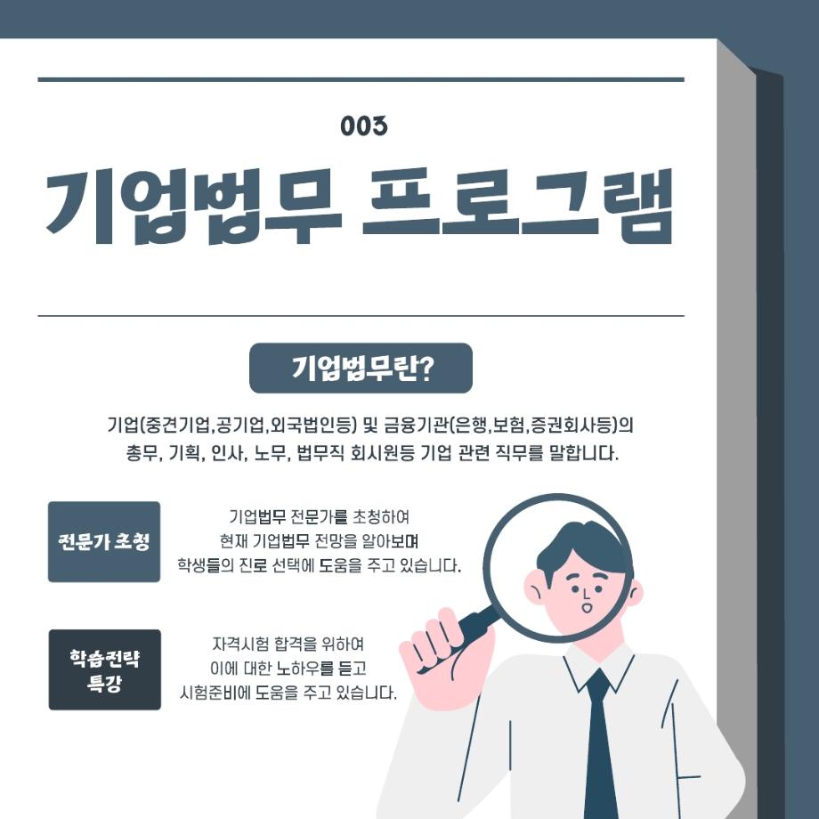 본문 시작 홈으로 학과과정 학과안내 교수소개 학과과정 커뮤니티 홈페이지가이드 비교과프로그램 교육과정 전공교육 체계도 대학원 법학과 비교과프로그램 학사일정 기업법무 지원프로그램 공공법무 지원프로그램 기업법무 지원프로그램 기업법무 지원프로그램 페이스북 트위터 프린트 비교과 프로그램 알아보기 '기업법무' 법학과 408 2025-09-04 목록 이전기업법무 지원프로그램이란??? 이전2025.05.21 항공운송법 관련 특강 담당부서 : 법학과 담당자 : - 연락처 : 043-649-1764 최종수정일 : 2024-10-26 만족도조사 만족도 조사 이 페이지에서 제공하는 정보에 대하여 만족하시나요? 매우만족 만족 보통 불만족 매우불만족