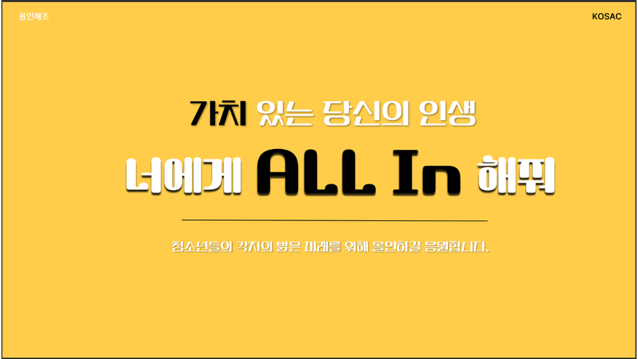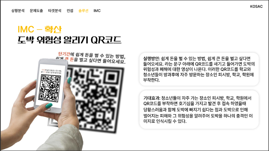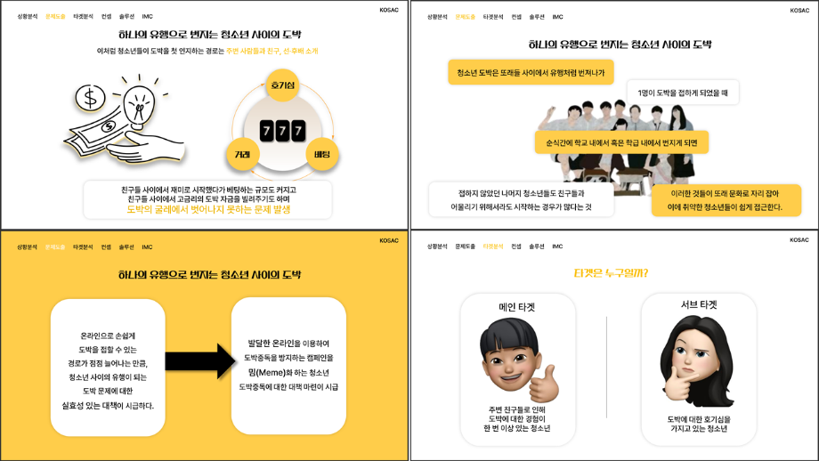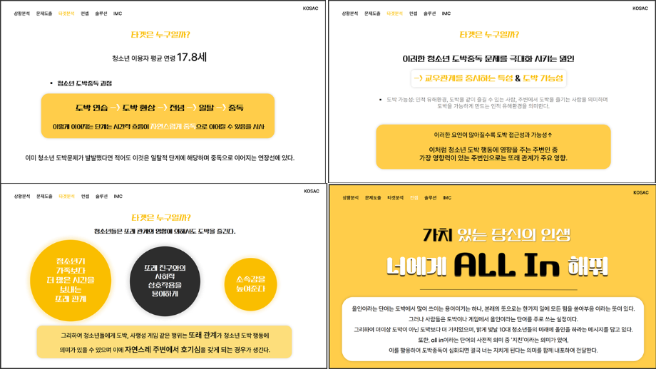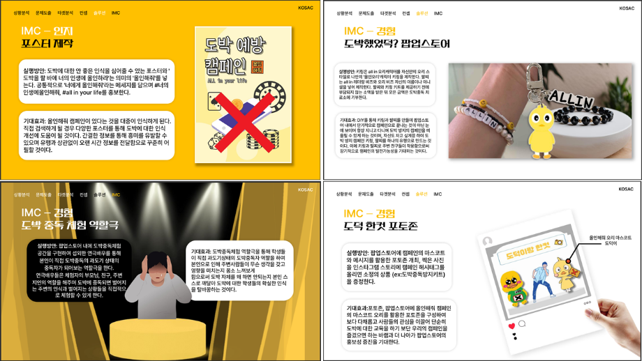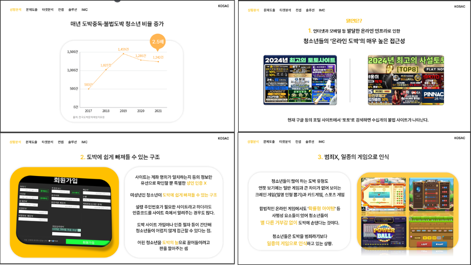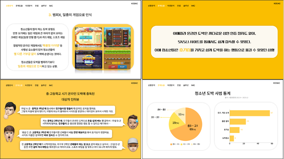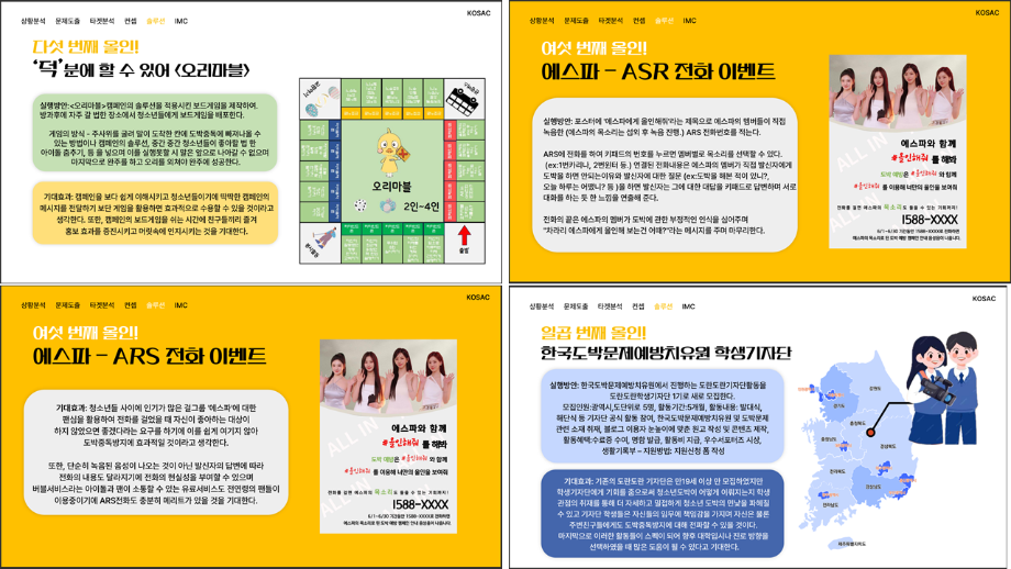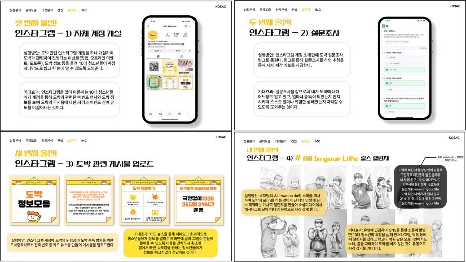 본문 시작 홈으로 흥미로운 교육과정 매력적인 학과소개 흥미로운 교육과정 특별CC프로그램 We can 취업 따뜻한 커뮤니티 홈페이지가이드 작품 갤러리 교육일정 교육과정 전공교육 체계도 졸업후진로 작품 갤러리 작품 갤러리 페이스북 트위터 프린트 [2024KOSAC]대한민국대학생광고대회 출품작 광고홍보학과 3797 2024-09-09 2024년도 대한민국 대학생 광고대회 출품작 주제 : 청소년 도박중독 방지를 위한 국민 참여 캠페인 제안서 세명대 광고홍보학과는 '기획맛집'을 지향하고, 이를 인정받고 있습니다 : ) 목록 이전[사회과학조사방법론]키오스경험인식조사 다음 [2024KOSAC]대한민국대학생광고대회 출품작