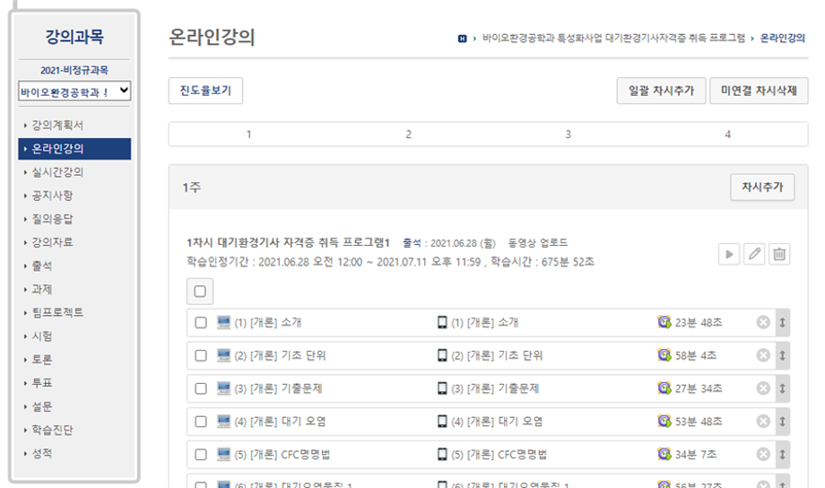 본문 시작 홈으로 학과과정 학과소개 교수소개 학과과정 커뮤니티 홈페이지가이드 비교과프로그램 교육과정 전공교육 체계도 졸업요건 비교과프로그램 특성화 환경기사자격증 취득 특성화 환경기사자격증 취득 환경기사자격증 멘토링 시스템 환경기사자격증 단기실무 학과 특성화 포인트 제도 대학혁신지원Creative Cube 특성화 환경기사자격증 취득 페이스북 트위터 프린트 2021학년도 특성화 환경기사 자격증 취득 프로그램 시행 바이오환경공학과 3582 2022-01-26 2021학년도 특성화 환경기사 자격증 취득 프로그램을 하계 방학동안 비대면으로 실시하였습니다. 본 프로그램을 통해 재학생들이 환경기사 자격증을 취득하며 진로 의사결정에 도움이 되었으면 좋겠습니다! 다음 학년도에도 많은 관심과 참여 해주시고 자격증 취득을 기원합니다! 목록 이전특성화 환경기사 자격증 프로그램 담당부서 : 환경에너지학과 담당자 : - 연락처 : 043-649-1337 최종수정일 : 2024-10-26 만족도조사 만족도 조사 이 페이지에서 제공하는 정보에 대하여 만족하시나요? 매우만족 만족 보통 불만족 매우불만족