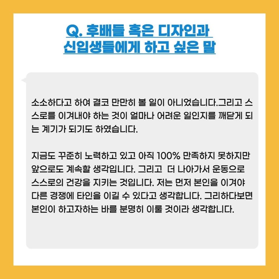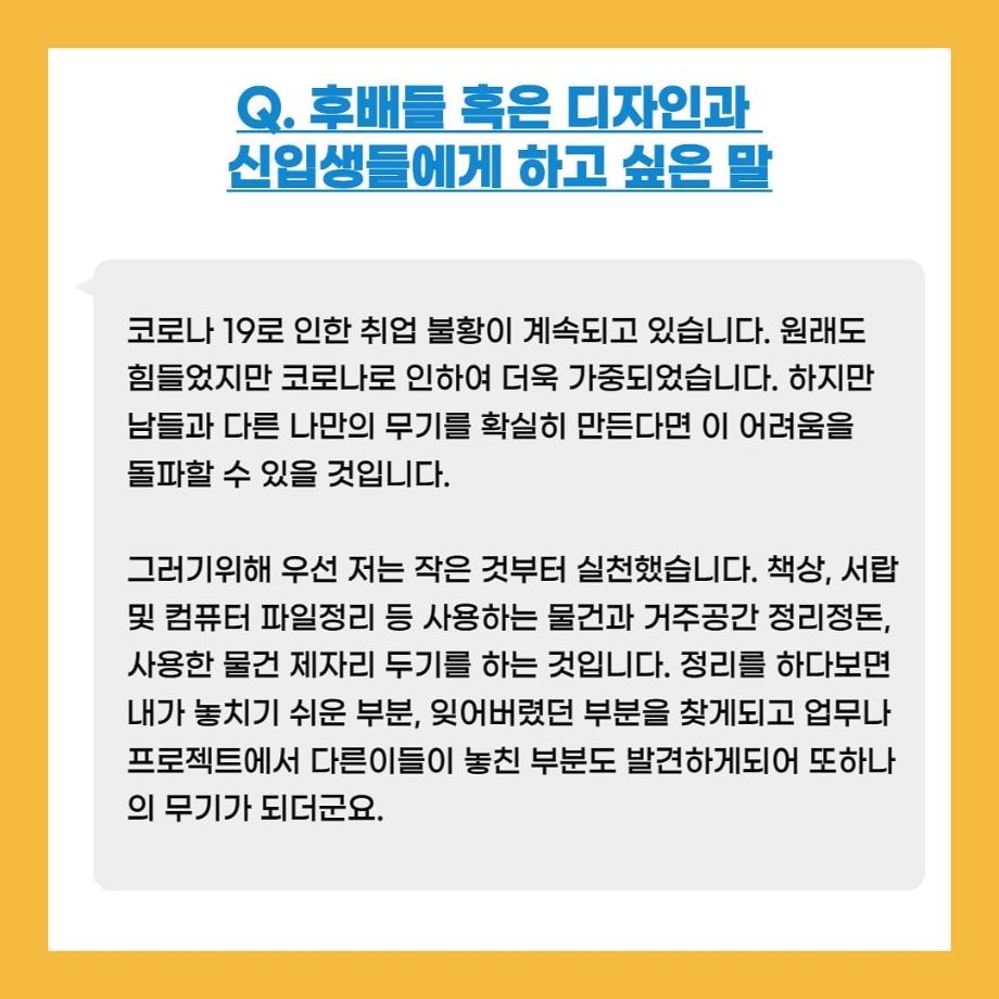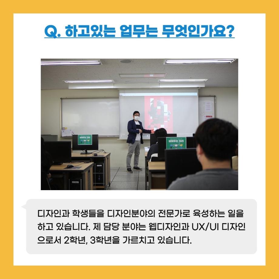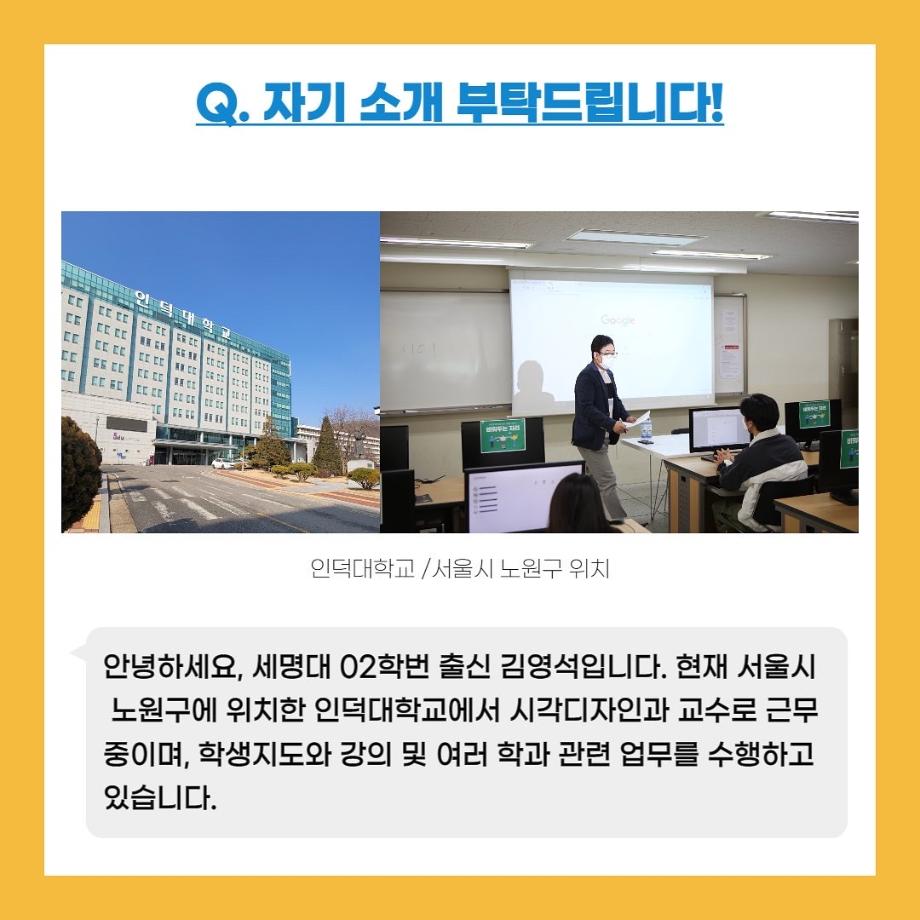 본문 시작 홈으로 입학/취업 학과소개 학과과정 시영소식 입학/취업 AI 학과자랑 SNS소통 홈페이지가이드 취업지금 입학여기 취업지금 전공소개 취업지금 페이스북 트위터 프린트 자랑스럽고 빛나는 선배들 2탄! 시각영상디자인학과 2540 2022-02-07 목록 이전자랑스럽고 빛나는 선배들 1탄! 다음 시디과 졸업 후 어디로 나아갈까? 3 담당부서 : 시각영상디자인학과 담당자 : - 연락처 : 043-649-1726 최종수정일 : 2024-10-26 만족도조사 만족도 조사 이 페이지에서 제공하는 정보에 대하여 만족하시나요? 매우만족 만족 보통 불만족 매우불만족