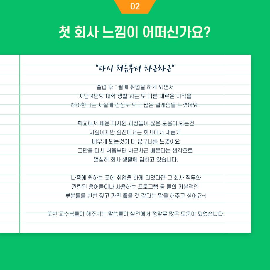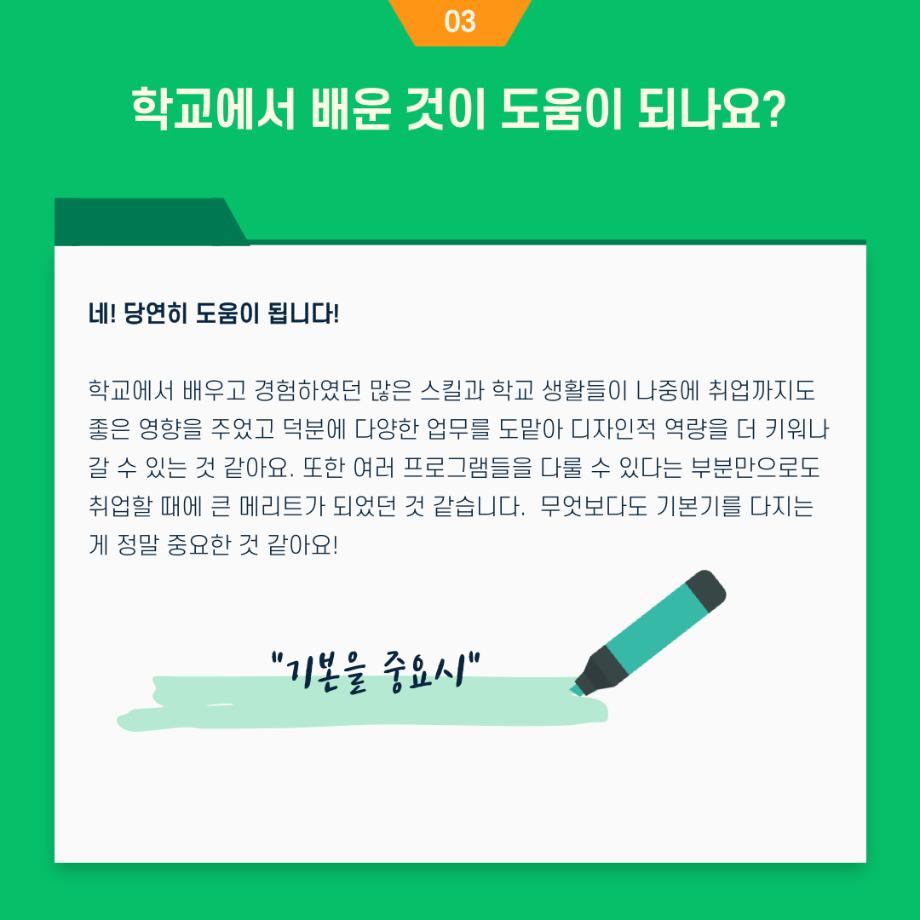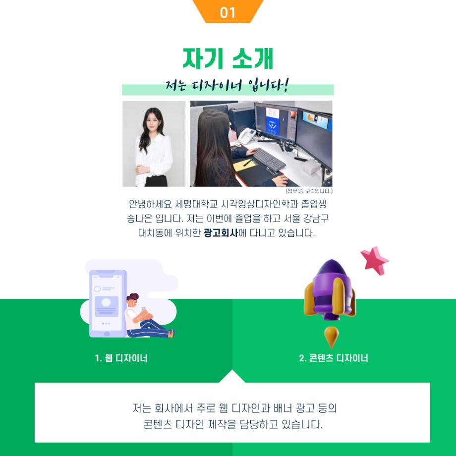본문 시작 홈으로 입학/취업 학과소개 학과과정 시영소식 입학/취업 AI 학과자랑 SNS소통 홈페이지가이드 취업지금 입학여기 취업지금 전공소개 취업지금 페이스북 트위터 프린트 시각영상디자인학과 19학번 송나은 졸업생 - 서울 강남구 대치동 광고회사 취업! 시각영상디자인학과 2567 2023-02-27 목록 이전「대한민국 채용박람회」 개최 안내 다음 시각영상디자인학과 윤지훈 졸업생 - 가산디지털단지 디자인회사 취업! 담당부서 : 시각영상디자인학과 담당자 : - 연락처 : 043-649-1726 최종수정일 : 2024-10-26 만족도조사 만족도 조사 이 페이지에서 제공하는 정보에 대하여 만족하시나요? 매우만족 만족 보통 불만족 매우불만족