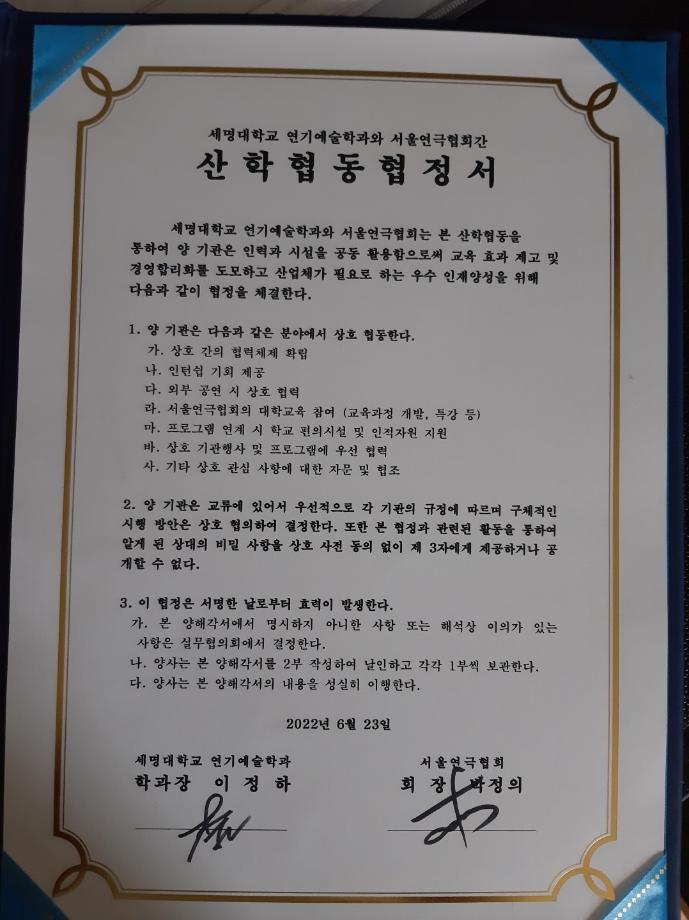 본문 시작 홈으로 학과과정 학과소개 입학정보 교수소개 학과과정 커뮤니티 공연예매 안내 홈페이지가이드 MOU 체결 교육과정 전공교육 체계도 비교과프로그램 MOU 체결 MOU 체결 페이스북 트위터 프린트 세명대학교 연기예술학과 서울연극협회 산학 협동 협정서 연기예술학과 2994 2022-07-12 목록 이전세명대학교 (전방송연예학과와) (현 연기예술학과) 극단 이유 산학 협동 협정서 다음 세명대학교 연기예술학과, 극단 명작옥수수밭과 산학협력협약(MOU) 체결 만족도조사 만족도 조사 이 페이지에서 제공하는 정보에 대하여 만족하시나요? 매우만족 만족 보통 불만족 매우불만족