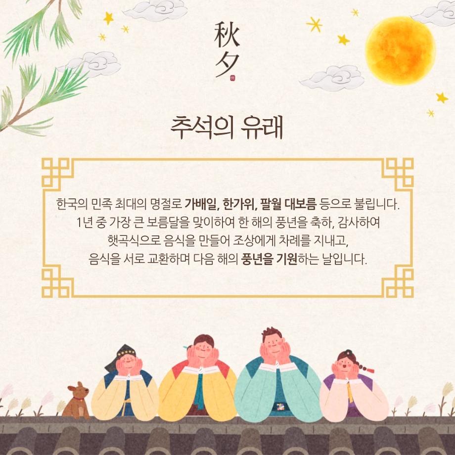 본문 시작 홈으로 학부소식 학부소개 교육과정 학부소식 커뮤니티 홈페이지가이드 미문한컷 공지사항 학사일정 학부행사 미문뉴스 미문한컷 포토갤러리 미문한컷 페이스북 트위터 프린트 미문 한 컷 | 일곱 번째 이야기 미디어문화학부 1683 2022-09-09 여러분 안녕하세요! 추석 연휴가 시작되었습니다 :) 혹시 추석의 유래를 알고 계신가요? 모르셨다면 카드뉴스를 통해 간단히 살펴보면 좋을 것 같아요! 다들 보름달처럼 마음마저 가득 찬 풍요로운 추석 보내시길 바랍니다! 긴 연휴, 잘 쉬고 건강한 모습으로 다시 만나요-! 목록 다음 미문 한 컷 | 여덟 번째 이야기 다음 미문 한 컷 | 아홉 번째 이야기 만족도조사 만족도 조사 이 페이지에서 제공하는 정보에 대하여 만족하시나요? 매우만족 만족 보통 불만족 매우불만족