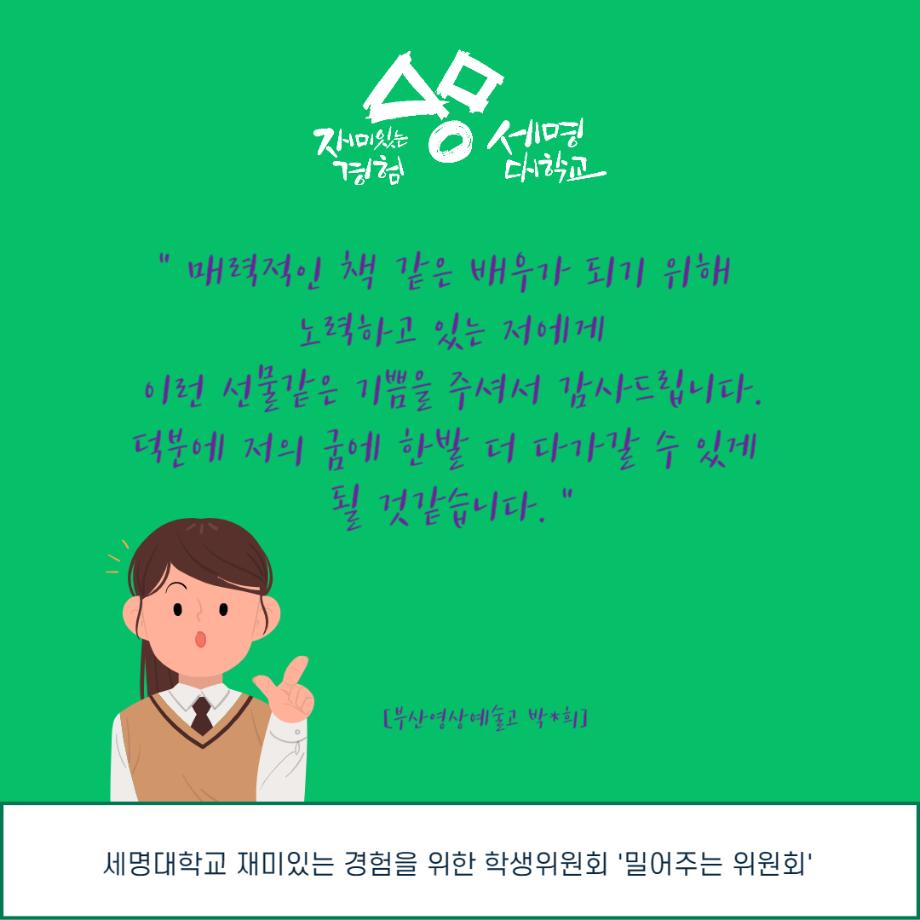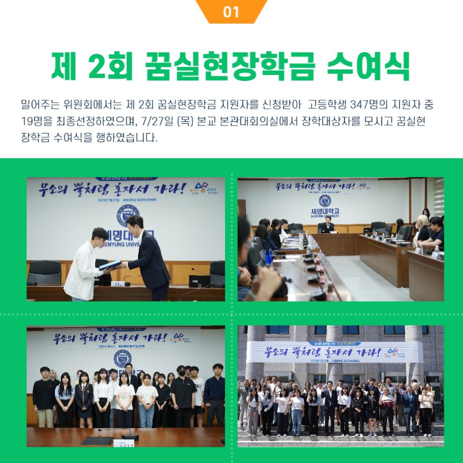 본문 시작 홈으로 포토갤러리 학생위원회 개요 학생위원회 소개 공지사항 활동결과 홈페이지가이드 포토갤러리 페이스북 트위터 프린트 [밀어주는 위원회] 제 2회 꿈실현장학금 수여식 [무소출정식] 입학관리본부 7047 2023-07-27 제 2회 꿈실현장학금 수여식 일정 : 2027.07.27 14시 본관 3층 대회의실 대상 : 꿈실현장학금 수헤자 19명 목록 이전[춤추는 위원회] 제 2회 청춘콘서트 이전[생각하는 위원회] 생각게시판 결과 담당부서 : 장학복지팀 담당자 : - 연락처 : 043-649-1142 최종수정일 : 2024-10-26 만족도조사 만족도 조사 이 페이지에서 제공하는 정보에 대하여 만족하시나요? 매우만족 만족 보통 불만족 매우불만족