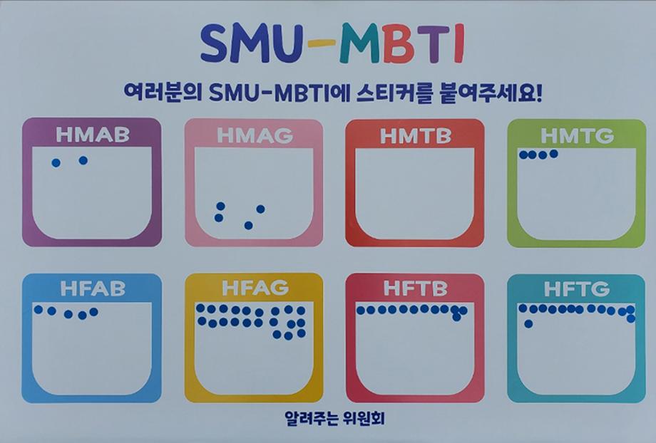 세명대만의 MBTI를 제작하여 학생들의 선호도를 조사하였고, 그 결과, 총 101명이 참여하였으며, HFAG(자취, 금공강, 발표수업, 국밥)을 제일 선호한다는 것을 알 수 있었다.