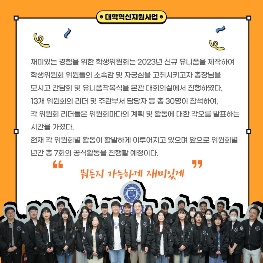 본문 시작 홈으로 포토갤러리 학생위원회 개요 학생위원회 소개 공지사항 활동결과 홈페이지가이드 포토갤러리 페이스북 트위터 프린트 [학생위원회] 2023 간담회 및 유니폼 착복식 시행 학생처 1822 2023-05-16 일시 : 2023.05.16(화) 장소 : 본관 3층 대회의실 목록 다음 [따뜻한 위원회]너의 학점을 처방해줄게 다음 [이상한 위원회] 학생식당 환경개선 및 특별메뉴 판매 담당부서 : 장학복지팀 담당자 : - 연락처 : 043-649-1142 최종수정일 : 2024-10-26 만족도조사 만족도 조사 이 페이지에서 제공하는 정보에 대하여 만족하시나요? 매우만족 만족 보통 불만족 매우불만족