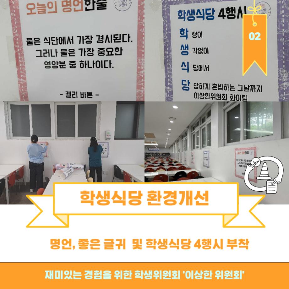 본문 시작 홈으로 포토갤러리 학생위원회 개요 학생위원회 소개 공지사항 활동결과 홈페이지가이드 포토갤러리 페이스북 트위터 프린트 [이상한 위원회] 학생식당 환경개선 및 특별메뉴 판매 학생처 9105 2023-07-07 이상한위원회 특별메뉴 판매 목록 이전[학생위원회] 2023 간담회 및 유니폼 착복식 시행 이전[춤추는 위원회] 제 2회 청춘콘서트 담당부서 : 장학복지팀 담당자 : - 연락처 : 043-649-1142 최종수정일 : 2024-10-26 만족도조사 만족도 조사 이 페이지에서 제공하는 정보에 대하여 만족하시나요? 매우만족 만족 보통 불만족 매우불만족
