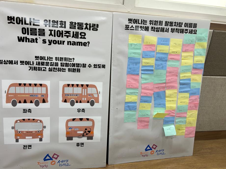 벗어나는 위원회 활동 내용 및 활동 계획 등의 홍보활동을 진행하였고, 위원회 활동 차량 이름짓기 이벤트를 실시하여 재학생 100명이 참여했으며, 참여 학생에게는 간단한 간식을 증정하였다.