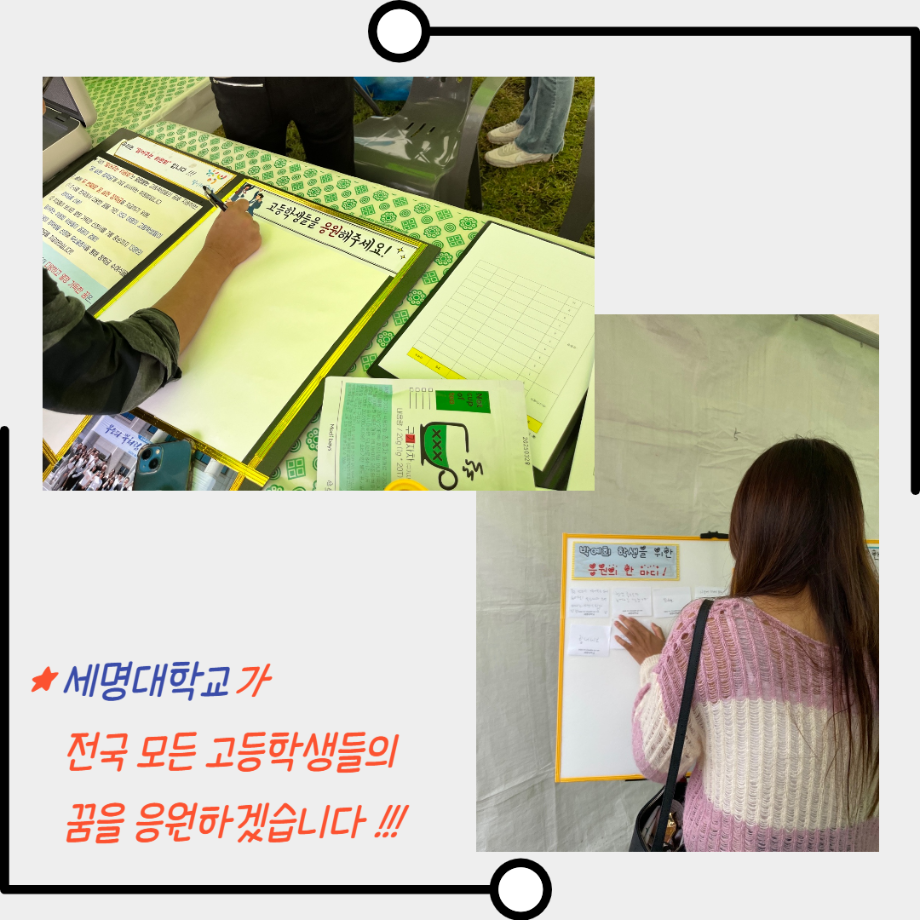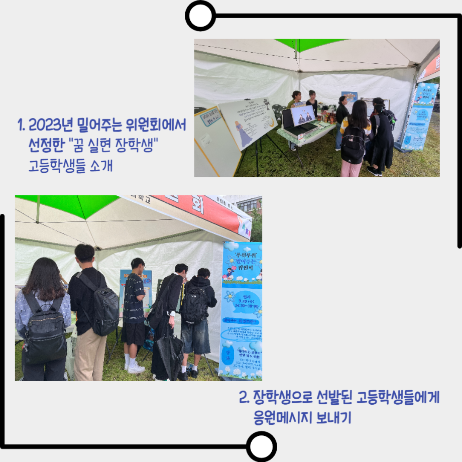 본문 시작 홈으로 포토갤러리 학생위원회 개요 학생위원회 소개 공지사항 활동결과 홈페이지가이드 포토갤러리 페이스북 트위터 프린트 [밀어주는 위원회] 꿈실현장학금 교내홍보 입학관리본부 1860 2023-10-04 저희 밀어주는 위원회는 2023년 청룡축전 때. 올해 꿈 실현 장학금을 받은 19명의 고등학생들에 대해서 소개하는 행사를 가졌습니다. 또한 본교 재학생들을 통해 꿈 실현 장학금을 받은 고등학생들에게 보내는 응원메시지를 받아 전달할 예정입니다. 목록 이전[벗어나는위원회] 위원회 홍보 및 활동차량이름짓기 이벤트 다음 [맛있는 위원회] 바쁜 대학생활, 숨 좀 고를 터? 담당부서 : 장학복지팀 담당자 : - 연락처 : 043-649-1142 최종수정일 : 2024-10-26 만족도조사 만족도 조사 이 페이지에서 제공하는 정보에 대하여 만족하시나요? 매우만족 만족 보통 불만족 매우불만족