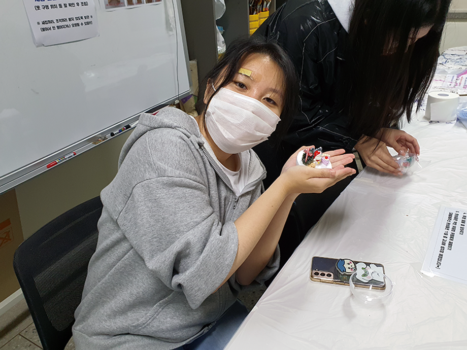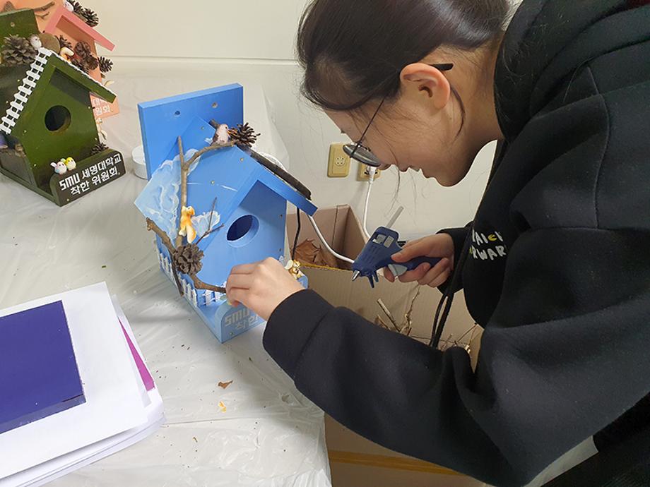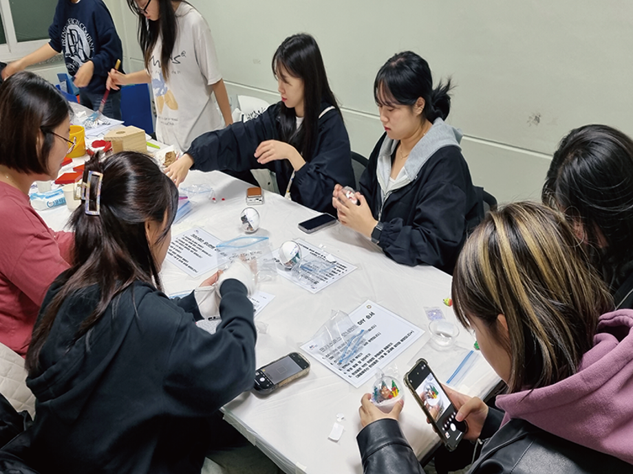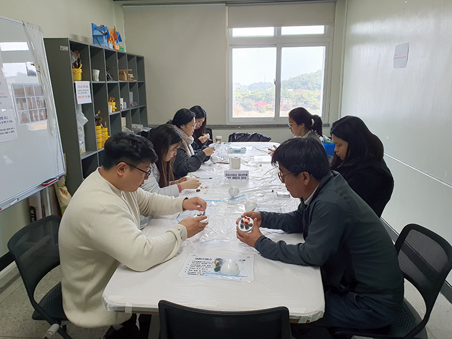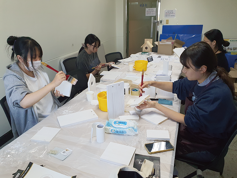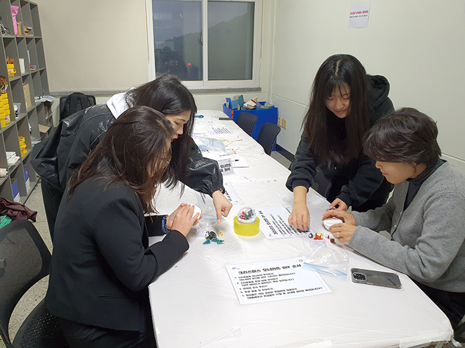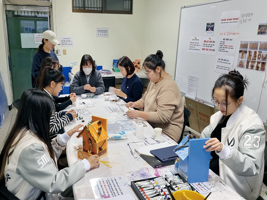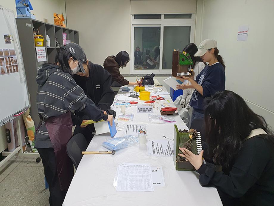 본문 시작 홈으로 포토갤러리 학생위원회 개요 학생위원회 소개 공지사항 활동결과 홈페이지가이드 포토갤러리 페이스북 트위터 프린트 [착한 위원회] 2023-2학기 포롱포롱 공방 운영 결과 학생처 4148 2023-11-02 [착한 위원회] 2023-2학기 포롱포롱 공방 운영 결과 1. 운영기간 : 2023년 10월 2. 운영장소 : 학생회관 519호 3. 운영내용 - 자연물과 미니어처를 활용한 새집 만들기 - 미니어처를 활용한 크리스마스 오너먼트 만들기 체험 4. 참여인원 : 54명 - 위원 12명, 재학생 24명, 교직원 18명 5. 제작수량 : 새집 14개, 크리스마스 오너먼트 54개 - 11월 중 교내 숲에 설치 예정 목록 이전[용감한위원회]참깨마켓 및 용감한 창업자 부스 운영 다음 [밀어주는 위원회] 2023년 2학기. 두 번째 행사 담당부서 : 장학복지팀 담당자 : - 연락처 : 043-649-1142 최종수정일 : 2024-10-26 만족도조사 만족도 조사 이 페이지에서 제공하는 정보에 대하여 만족하시나요? 매우만족 만족 보통 불만족 매우불만족