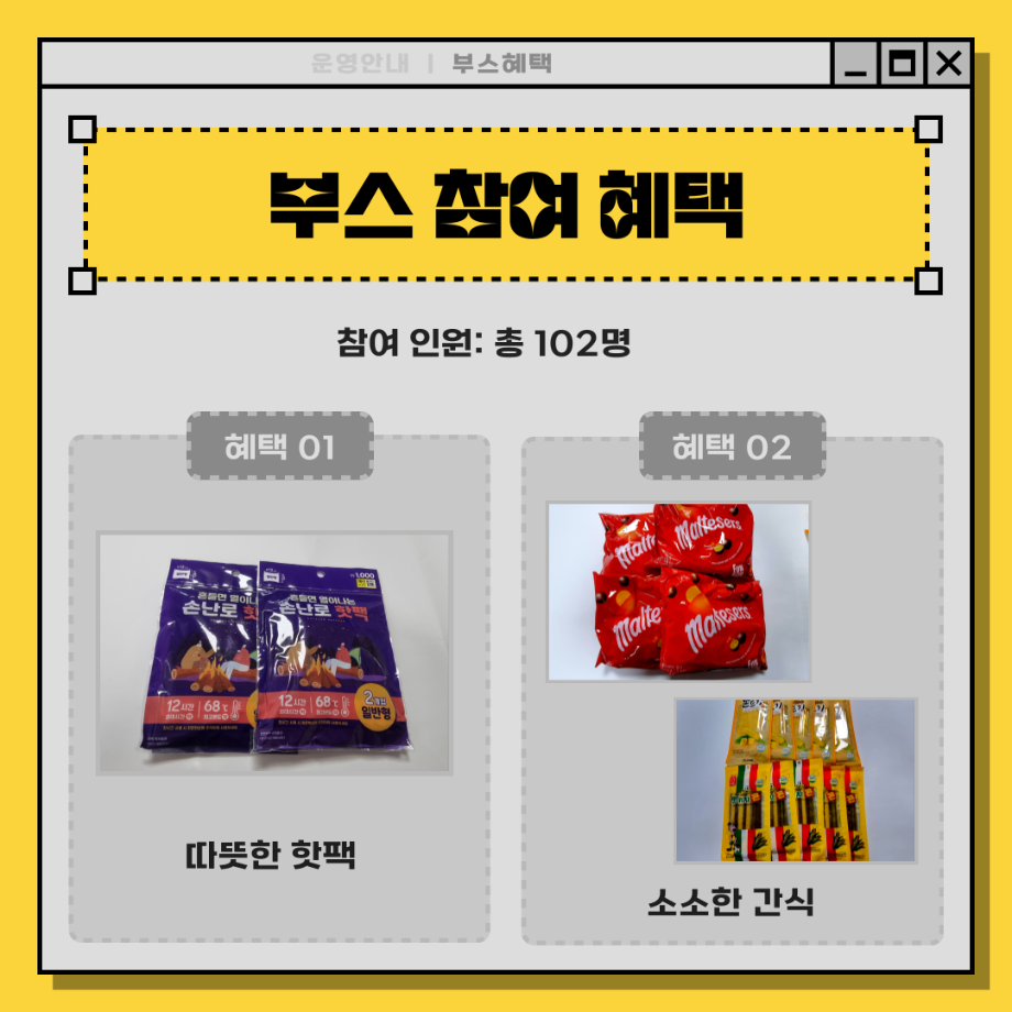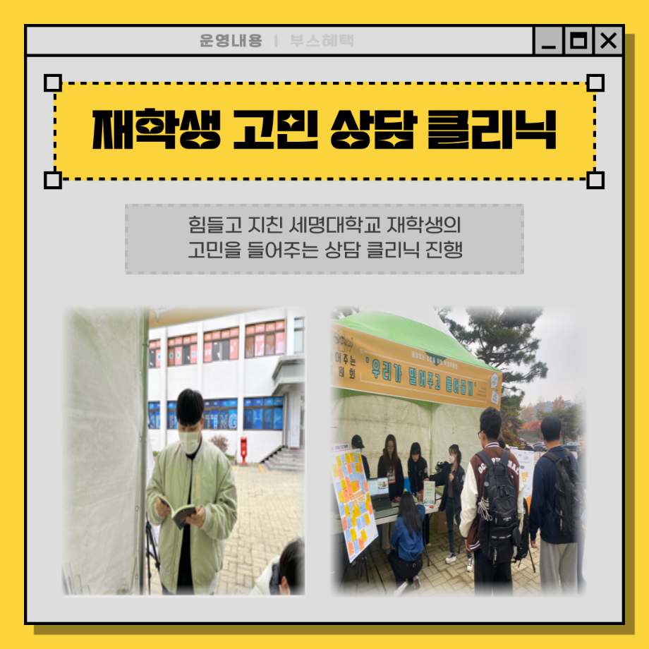 본문 시작 홈으로 포토갤러리 학생위원회 개요 학생위원회 소개 공지사항 활동결과 홈페이지가이드 포토갤러리 페이스북 트위터 프린트 [밀어주는 위원회] 2023년 2학기. 두 번째 행사 입학관리본부 3257 2023-11-09 1. 행사일정 : 2023.11.01.(수) 2. 행사장소 : 세명스퀘어(학생회관 앞 광장) 3. 행사내용 - 세명대학교 재학생들이 고3 수험생들에게 수능 응원 메시지 보내기 - 재학생 고민 상담 클리닉 4. 행사참여인원 : 102명 목록 이전[착한 위원회] 2023-2학기 포롱포롱 공방 운영 결과 다음 [착한위원회] 최종보고회 착한위원회SNS팔로우 이벤트 담당부서 : 장학복지팀 담당자 : - 연락처 : 043-649-1142 최종수정일 : 2024-10-26 만족도조사 만족도 조사 이 페이지에서 제공하는 정보에 대하여 만족하시나요? 매우만족 만족 보통 불만족 매우불만족