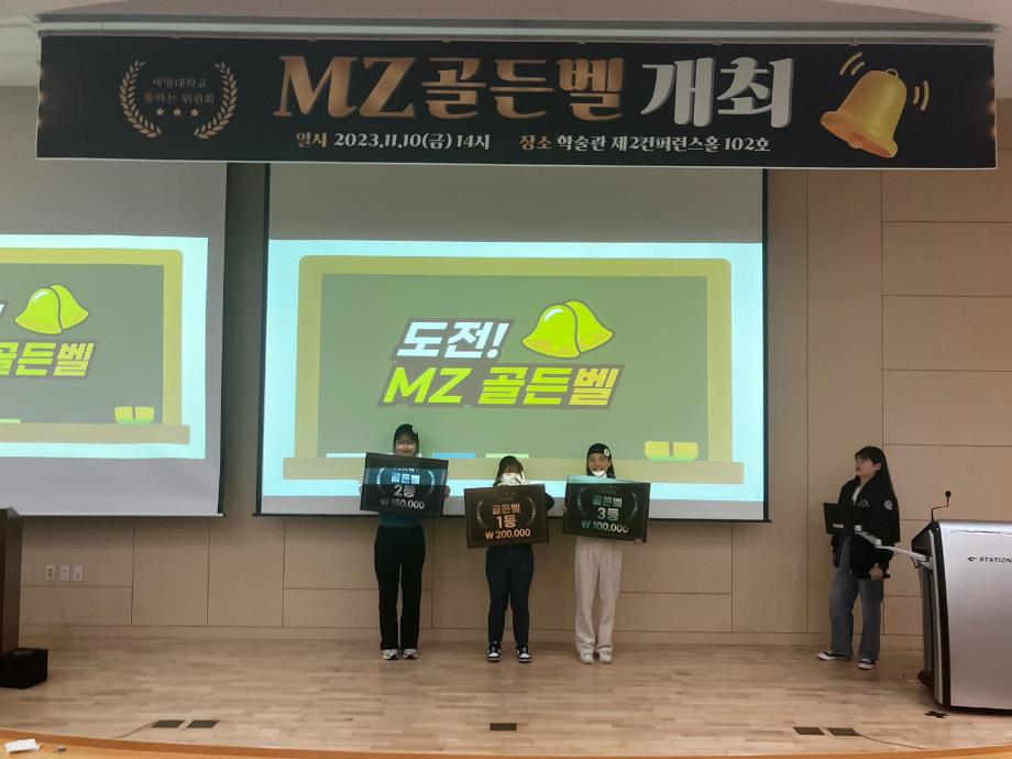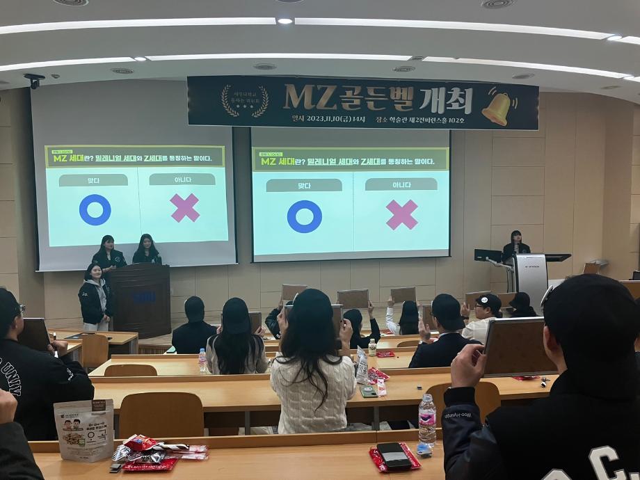 본문 시작 홈으로 포토갤러리 학생위원회 개요 학생위원회 소개 공지사항 활동결과 홈페이지가이드 포토갤러리 페이스북 트위터 프린트 [통하는위원회] 통하는 위원회 < MZ골든벨 > 2874 2023-11-22 1. 행사일시 : 23년 11월 10일(금) 14시~16시 2. 행사장소 : 학술관 102호 3. 행사개요 : 세대 문화를 주제로 미니 골든벨을 개최하여 교직원과 재학생들이 서로의 문화를 배우고 소통할 수 있는 계기 마련 4. 행사내용 - 다양한 세대 문제를 출제하여 서로의 문화를 배우고 소통함 - 참여자 10명에게 랜덤 MZ 상품 증정 - 최종 3인에게 상금 증정 5. 참여인원 : 28명 목록 이전[ 통하는 위원회] MZ옷코디콘테스트 다음 [통하는 위원회] 최종보고회 부스 담당부서 : 장학복지팀 담당자 : - 연락처 : 043-649-1142 최종수정일 : 2024-10-26 만족도조사 만족도 조사 이 페이지에서 제공하는 정보에 대하여 만족하시나요? 매우만족 만족 보통 불만족 매우불만족