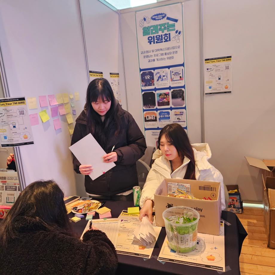 본문 시작 홈으로 포토갤러리 학생위원회 개요 학생위원회 소개 공지사항 활동결과 홈페이지가이드 포토갤러리 페이스북 트위터 프린트 [알려주는 위원회] 최종보고회 부스운영 대학혁신지원단 2944 2023-11-22 <알려주는 위원회 활동 결과 내용> [알려주는 위원회] 알려주는 위원회 Your Turn, Your TMI 역질문 이벤트 1. 행사일시: 2023년 11월 16일(목) 11:30~18:00 -제2회 학생위원회 최종보고회 기간 2. 행사장소: 학술관 1층 로비(알려주는 위원회 부스) 3. 행사내용 1) 알려주는 위원회 상담 및 가신청 2) 알려주는 위원회 팔로우 및 역질문 답글 달기 이벤트 3) 간식 나눔 4. 참여인원: 107명 목록 이전[통하는 위원회] 최종보고회 부스 이전[생각하는 위원회] 제 2회 멍때리기 대회 담당부서 : 장학복지팀 담당자 : - 연락처 : 043-649-1142 최종수정일 : 2024-10-26 만족도조사 만족도 조사 이 페이지에서 제공하는 정보에 대하여 만족하시나요? 매우만족 만족 보통 불만족 매우불만족