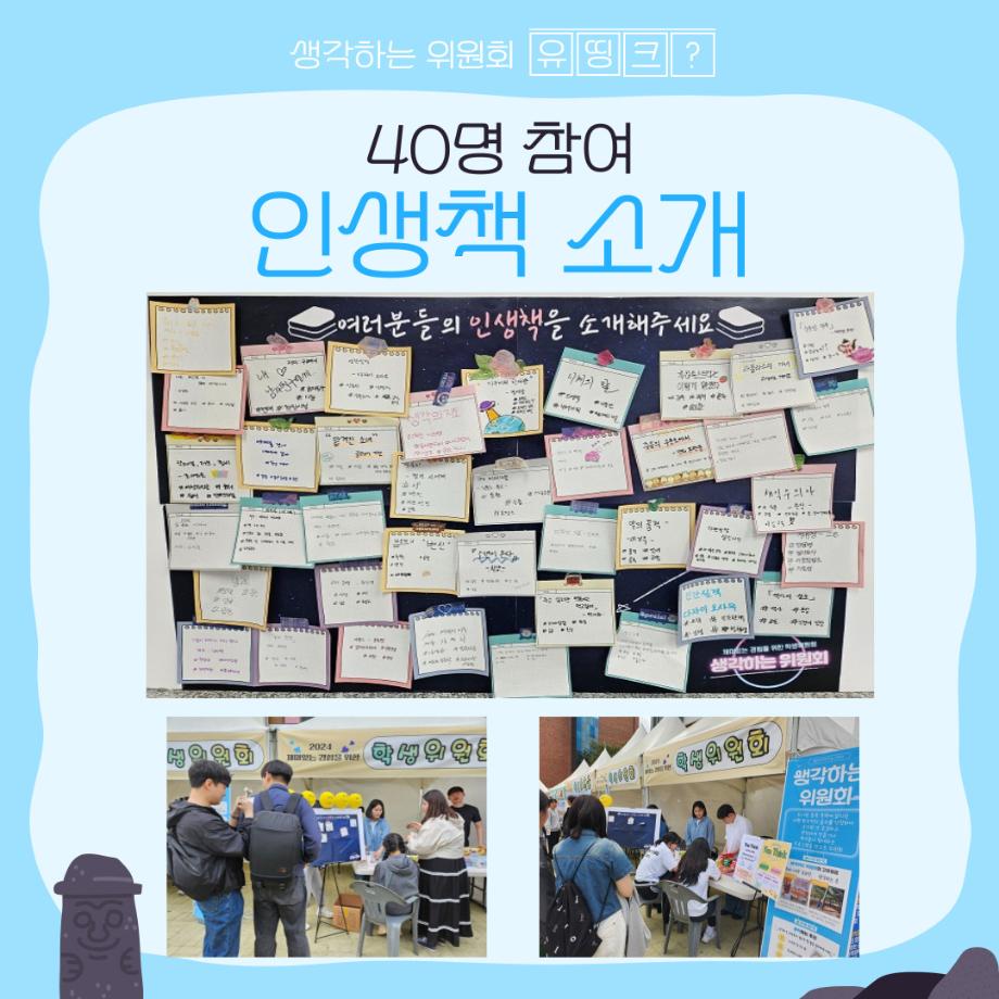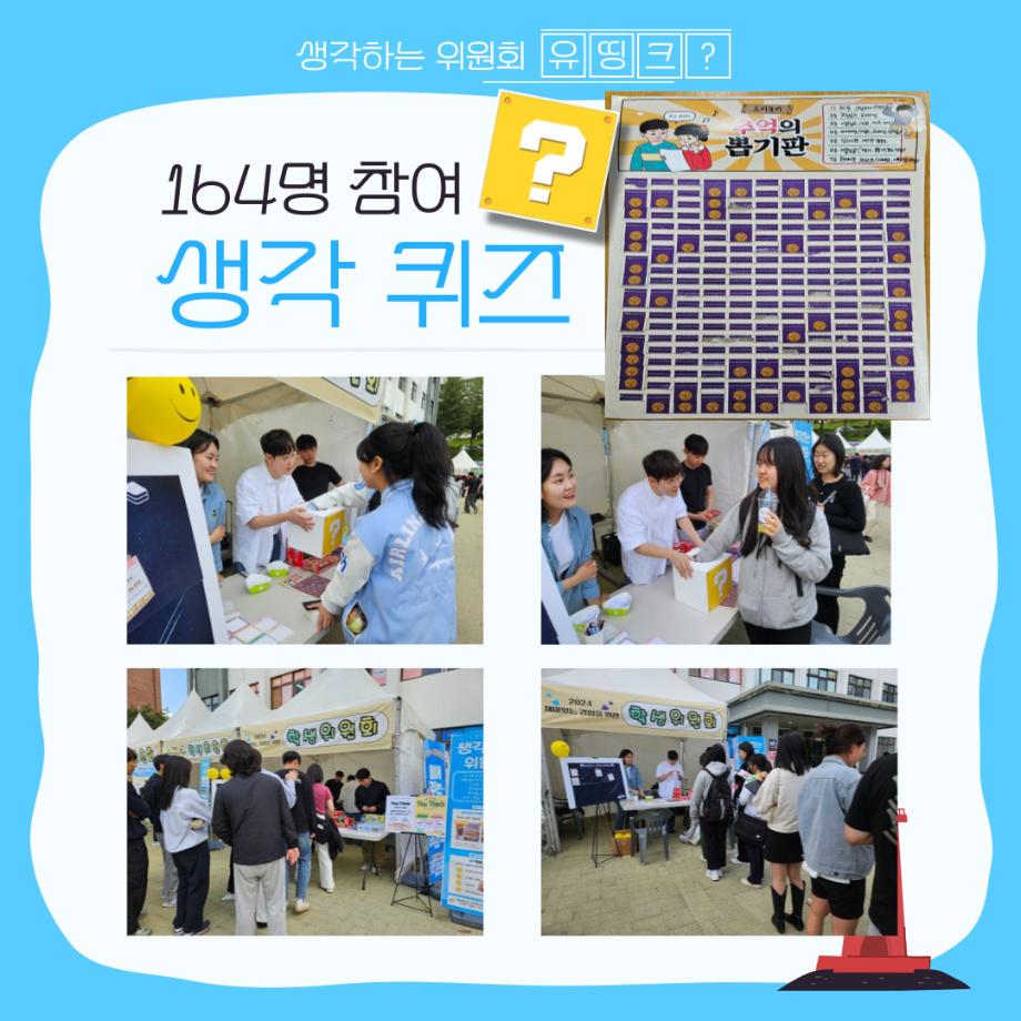 본문 시작 홈으로 포토갤러리 학생위원회 개요 학생위원회 소개 공지사항 활동결과 홈페이지가이드 포토갤러리 페이스북 트위터 프린트 [생각하는 위원회] You Think?(유띵크) 청룡체전부스 학술정보원 1788 2024-05-13 일시 : 2024.05.08(수) 14:00~17:00 장소 : 학생회관 앞 광장 학생위원회 부스 활동내용 : 생각퀴즈(생각박스, 상식퀴즈, 난센스퀴즈) 진행 참여인원 : 164명 참여 생각하는 위원회 행사에 많은 관심과 참여해 주신 구성원 여러분께 감사의 말씀드립니다! 추천해주신 인생책은 5월말 생각하는 위원회 행사에 반영될 예정입니다. 앞으로의 행사도 함께해 주세요:) 목록 이전[꽃피는 위원회] 행운을 가져다주는 책갈피 만들기 다음 [약속하는 위원회] <약속편지> 담당부서 : 장학복지팀 담당자 : - 연락처 : 043-649-1142 최종수정일 : 2024-10-26 만족도조사 만족도 조사 이 페이지에서 제공하는 정보에 대하여 만족하시나요? 매우만족 만족 보통 불만족 매우불만족