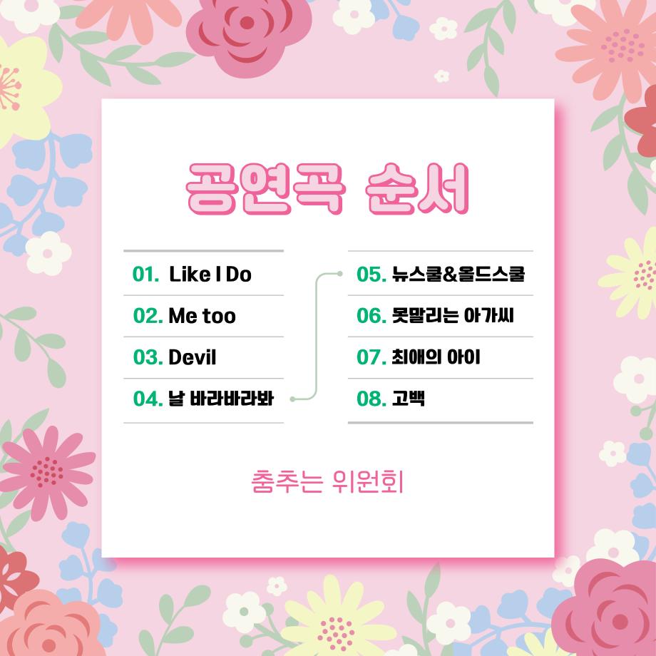 ❤ 아쉽게도 행사 이튿날엔 우천으로 공연 프로그램이 취소되어 첫 하루만 공연을 선보일 수 있었지만 맑은 날씨, 수많은 재학생들 앞에서 '춤추는 위원회'의 첫 인사 및 첫 활동의 시작을 알릴 수 있었습니다. 많은 관심과 환호를 보내주신 재학생 여러분들께 진심으로 감사합니다. ❤