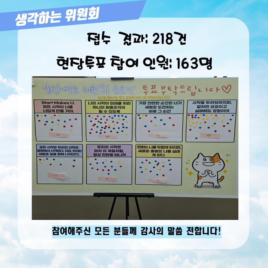 공모전은 218건 접수되었고 위원회 학생들이 1차 선정하여 7개의 후보로 현장투표를 진행하였습니다. 현장투표는 163명이 참여하여 주셨으며 2차 심사와 현장투표 결과를 합산하여 시상을 진행하였습니다. 1등 문구로 6월 5일 학술정보원(도서관) 동쪽 측벽에 대형 현수막을 설치하였습니다. 시상자분들 축하드리고 참여자분들께 감사의 말씀 전합니다.